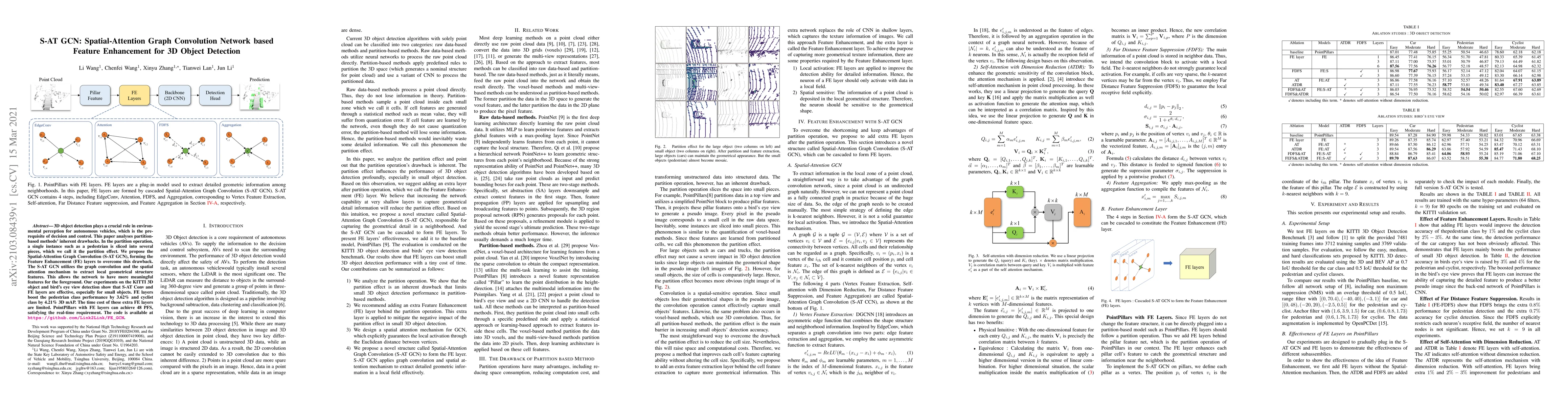 3D object detection plays a crucial role in environmental perception for autonomous vehicles, which is the prerequisite of decision and control. This paper analyses partition-based methods' inherent drawbacks. In the partition operation, a single instance such as a pedestrian is sliced into several pieces, which we call it the partition effect. We propose the Spatial-Attention Graph Convolution (S-AT GCN), forming the Feature Enhancement (FE) layers to overcome this drawback. The S-AT GCN utilizes the graph convolution and the spatial attention mechanism to extract local geometrical structure features. This allows the network to have more meaningful features for the foreground. Our experiments on the KITTI 3D object and bird's eye view detection show that S-AT Conv and FE layers are effective, especially for small objects. FE layers boost the pedestrian class performance by 3.62\% and cyclist class by 4.21\% 3D mAP. The time cost of these extra FE layers are limited. PointPillars with FE layers can achieve 48 PFS, satisfying the real-time requirement.