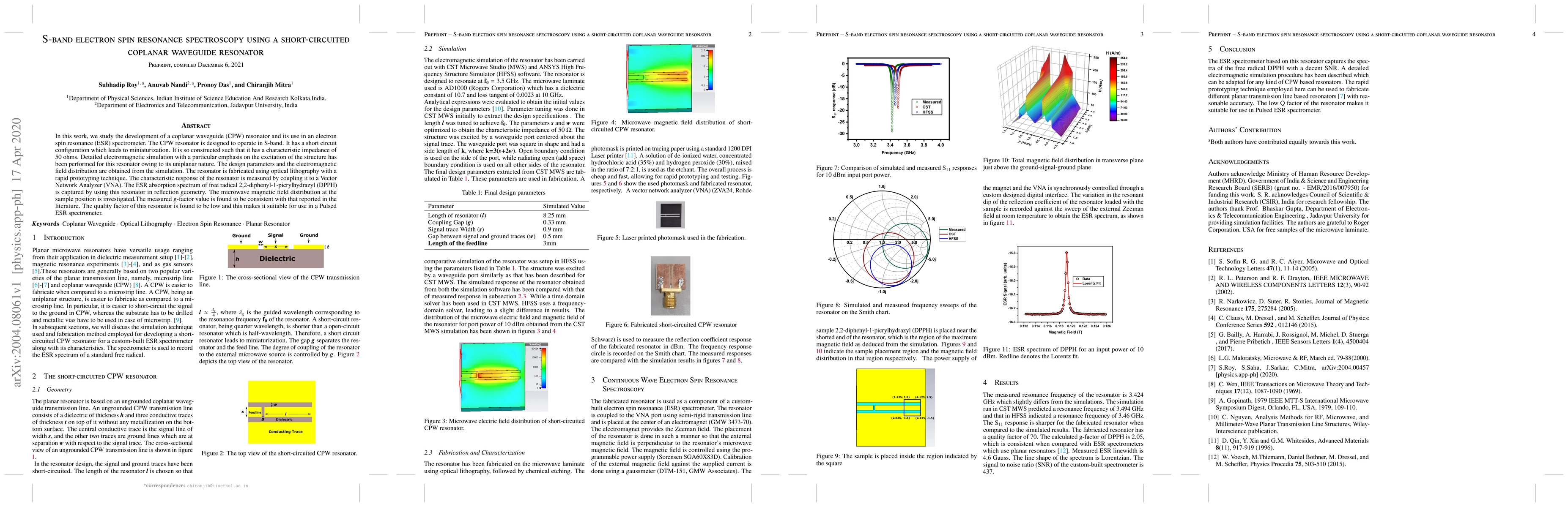 Researchers developed a miniaturized S-band electron spin resonance spectrometer using a short-circuited coplanar waveguide resonator, achieving consistent g-factor values with reported literature.