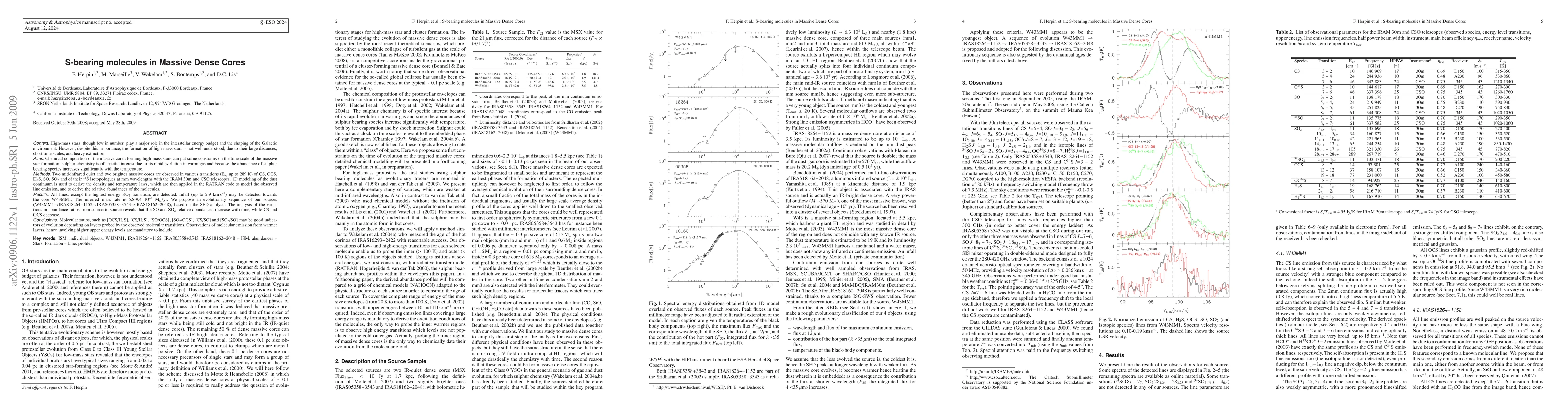 This study investigates the chemical composition of massive dense cores using observations of sulphur-bearing molecules like CS, OCS, H2S, SO, and SO2. The analysis reveals evolutionary trends in molecular abundances, suggesting that SO and SO2 increase while CS and OCS decrease over time, indicating the progression of star formation.