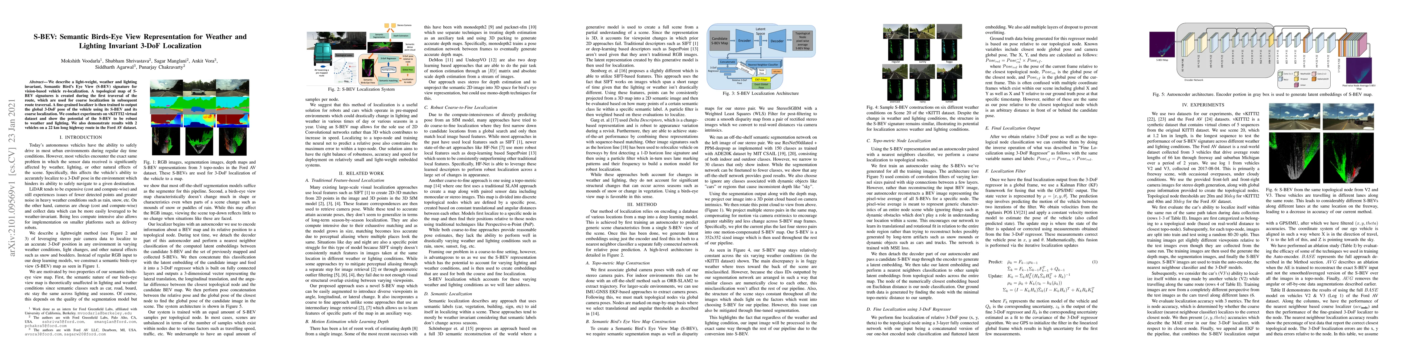 This paper proposes a Semantic Bird's Eye View (S-BEV) representation for vision-based vehicle localization that is invariant to weather and lighting. The method uses a topological map of S-BEV signatures for coarse localization, followed by a fine-grained localizer for precise 3-DoF pose determination, demonstrating robustness on both virtual and real-world datasets.