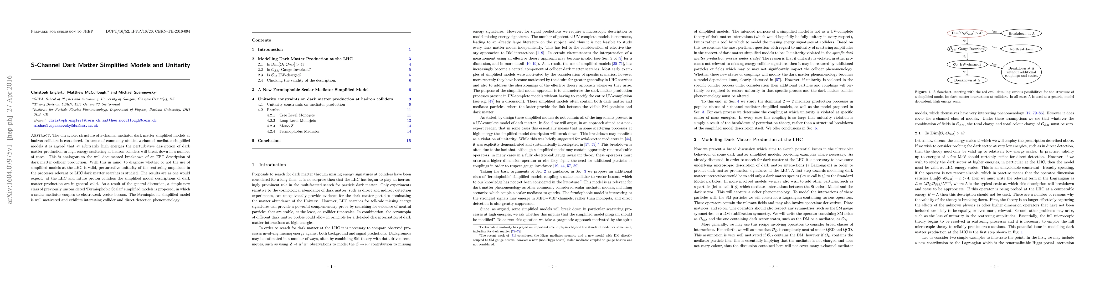 The ultraviolet structure of $s$-channel mediator dark matter simplified models at hadron colliders is considered. In terms of commonly studied $s$-channel mediator simplified models it is argued that at arbitrarily high energies the perturbative description of dark matter production in high energy scattering at hadron colliders will break down in a number of cases. This is analogous to the well documented breakdown of an EFT description of dark matter collider production. With this in mind, to diagnose whether or not the use of simplified models at the LHC is valid, perturbative unitarity of the scattering amplitude in the processes relevant to LHC dark matter searches is studied. The results are as one would expect: at the LHC and future proton colliders the simplified model descriptions of dark matter production are in general valid. As a result of the general discussion, a simple new class of previously unconsidered `Fermiophobic Scalar' simplified models is proposed, in which a scalar mediator couples to electroweak vector bosons. The Fermiophobic simplified model is well motivated and exhibits interesting collider and direct detection phenomenology.
