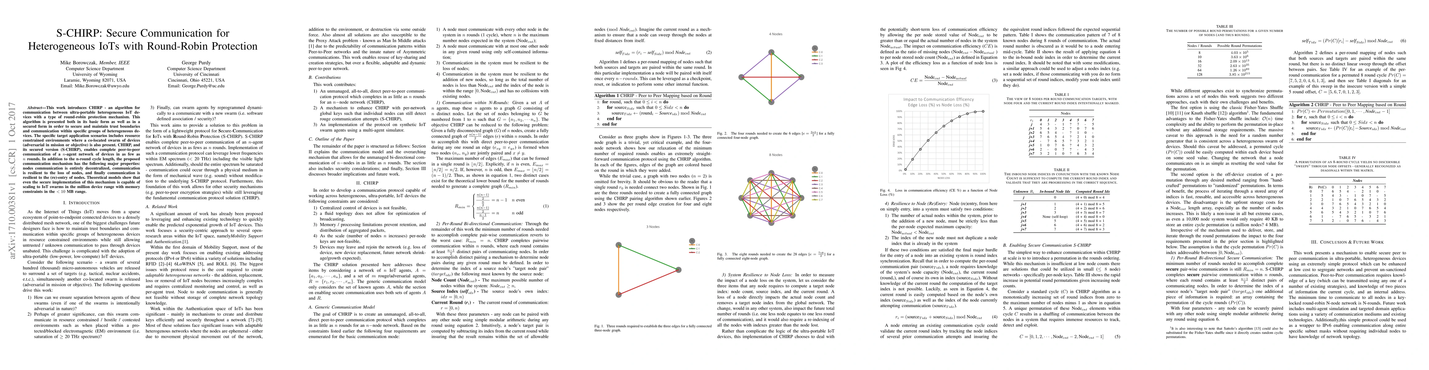 The paper introduces CHIRP, a decentralized algorithm for secure communication among heterogeneous IoT devices, and its secure version S-CHIRP, which maintains trust boundaries and communication integrity in adversarial environments. The algorithm enables n-round peer-to-peer communication in resource-constrained settings, demonstrating scalability to millions of devices with minimal memory requirements.