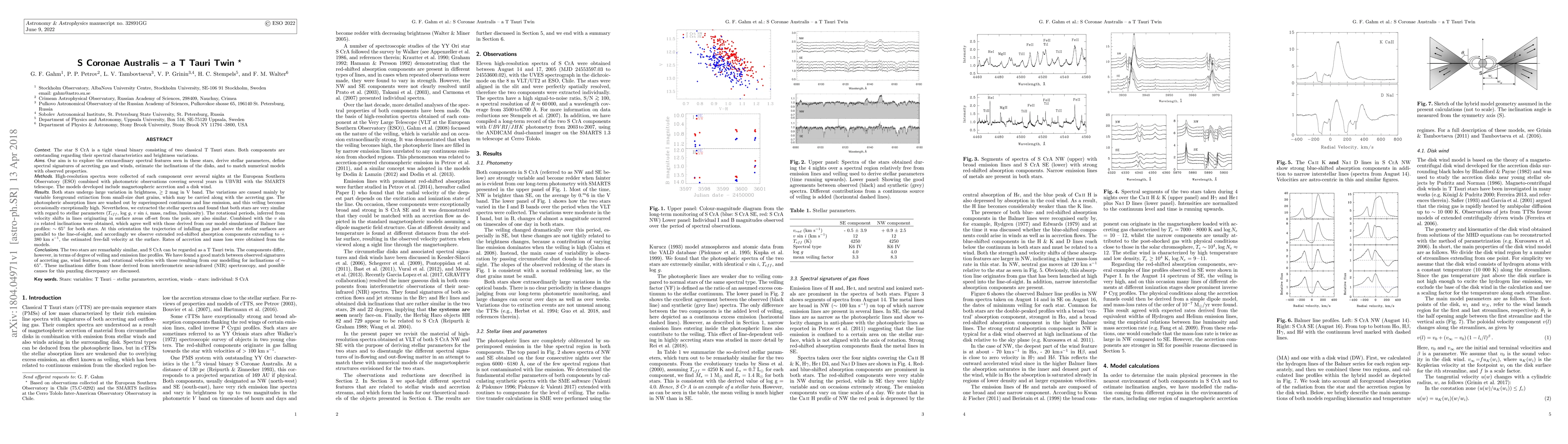 The star S CrA is a tight visual binary consisting of two classical T Tauri stars, both with outstanding spectral characteristics and brightness variations. High-resolution spectra were collected at ESO and photometric observations with the SMARTS telescope. Both stars undergo large variation in brightness caused mainly by variable foreground extinction. From the stellar parameters we conclude that the two stars are remarkably similar, and that S CrA can be regarded as a T Tauri twin. Rotational periods and inclinations are also similar. The stars differ, however, in terms of degree of veiling and emission line profiles. We compared observed Balmer emission line profiles with models including magnetospheric accretion and a disk wind. We found a good match between observed signatures of accreting gas, wind features, and rotational velocities with those resulting from our modelling for inclinations of around 65 degrees. At this orientation the trajectories of infalling gas just above the stellar surfaces are parallel to the line-of-sight, and accordingly we observe extended red-shifted absorption components extending to + 380 km/s, the estimated free-fall velocity at the surface. However, our so derived inclinations differ from those derived from interferometric near-infrared spectroscopy, and we discuss possible causes for this puzzling discrepancy.