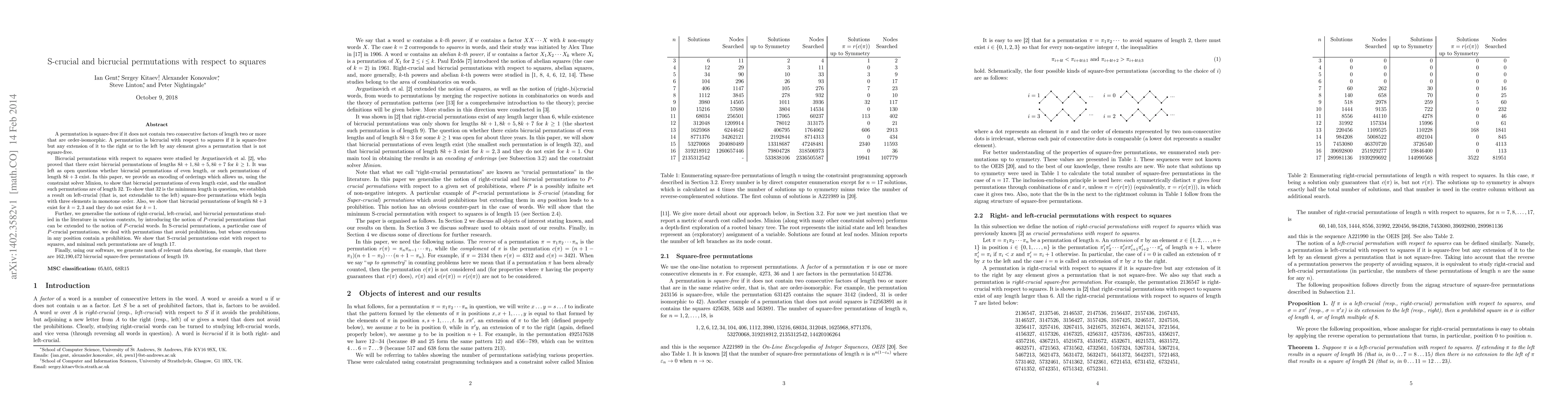 A permutation is square-free if it does not contain two consecutive factors of length two or more that are order-isomorphic. A permutation is bicrucial with respect to squares if it is square-free but any extension of it to the right or to the left by any element gives a permutation that is not square-free. Bicrucial permutations with respect to squares were studied by Avgustinovich et al., who proved that there exist bicrucial permutations of lengths $8k+1, 8k+5, 8k+7$ for $k\ge 1$. It was left as open questions whether bicrucial permutations of even length, or such permutations of length $8k+3$ exist. In this paper, we provide an encoding of orderings which allows us, using the constraint solver Minion, to show that bicrucial permutations of even length exist, and the smallest such permutations are of length 32. To show that 32 is the minimum length in question, we establish a result on left-crucial (that is, not extendable to the left) square-free permutations which begin with three elements in monotone order. Also, we show that bicrucial permutations of length $8k+3$ exist for $k=2,3$ and they do not exist for $k=1$. Further, we generalise the notions of right-crucial, left-crucial, and bicrucial permutations studied in the literature in various contexts, by introducing the notion of $P$-crucial permutations that can be extended to the notion of $P$-crucial words. In S-crucial permutations, a particular case of $P$-crucial permutations, we deal with permutations that avoid prohibitions, but whose extensions in any position contain a prohibition. We show that S-crucial permutations exist with respect to squares, and minimal such permutations are of length 17. Finally, using our software, we generate much of relevant data showing, for example, that there are 162,190,472 bicrucial square-free permutations of length 19.
