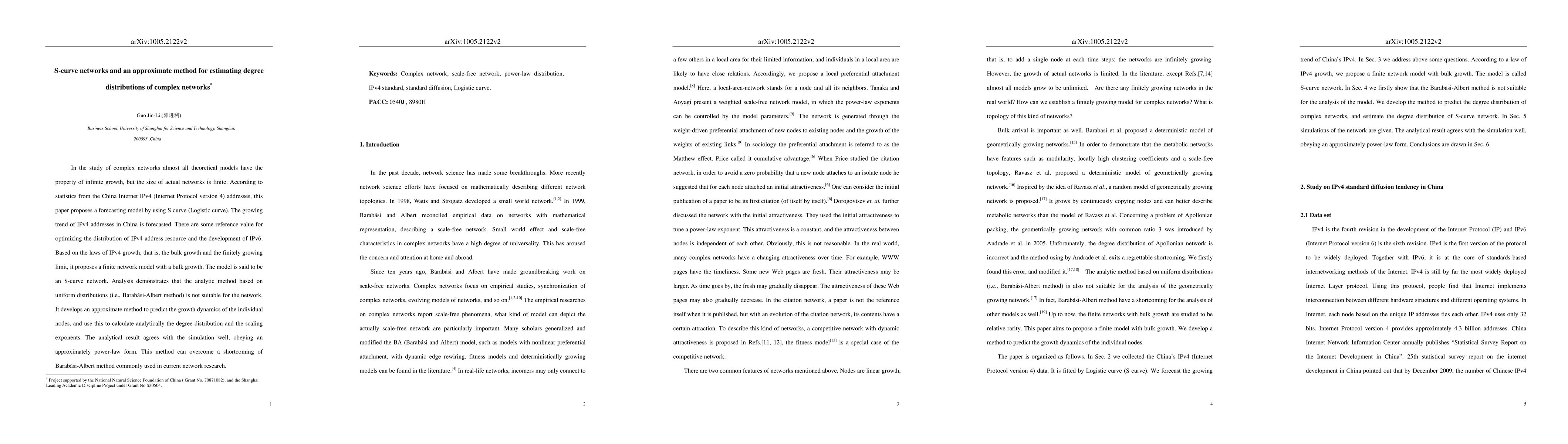 In the study of complex networks almost all theoretical models have the property of infinite growth, but the size of actual networks is finite. According to statistics from the China Internet IPv4 (Internet Protocol version 4) addresses, this paper proposes a forecasting model by using S curve (Logistic curve). The growing trend of IPv4 addresses in China is forecasted. There are some reference value for optimizing the distribution of IPv4 address resource and the development of IPv6. Based on the laws of IPv4 growth, that is, the bulk growth and the finitely growing limit, it proposes a finite network model with a bulk growth. The model is said to be an S-curve network. Analysis demonstrates that the analytic method based on uniform distributions (i.e., Barab\'asi-Albert method) is not suitable for the network. It develops an approximate method to predict the growth dynamics of the individual nodes, and use this to calculate analytically the degree distribution and the scaling exponents. The analytical result agrees with the simulation well, obeying an approximately power-law form. This method can overcome a shortcoming of Barab\'asi-Albert method commonly used in current network research.