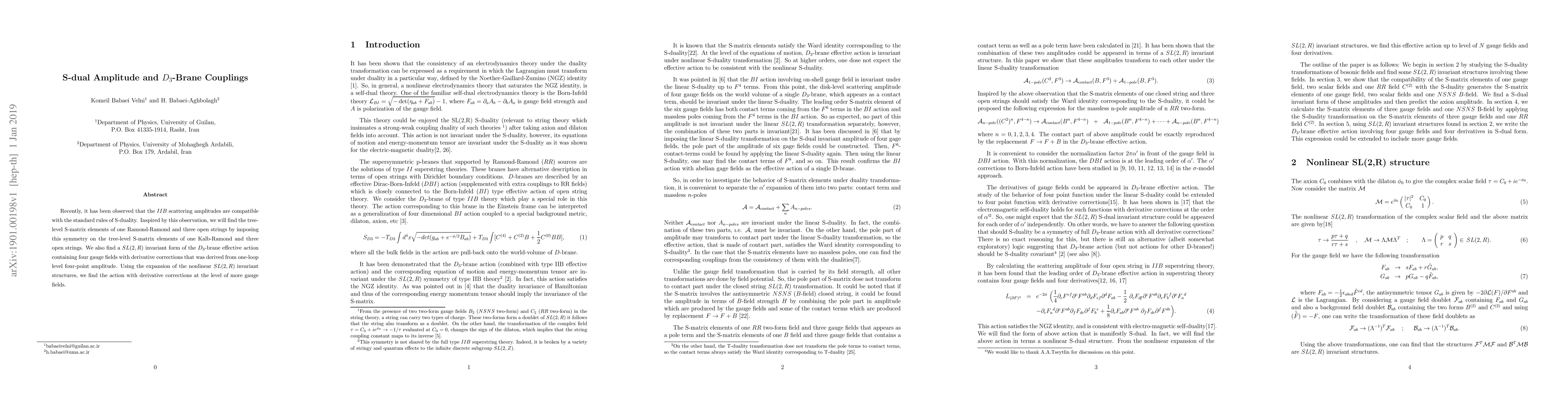 Recently, it has been observed that the IIB scattering amplitudes are compatible with the standard rules of S-duality. Inspired by this observation, we will find the tree-level S-matrix elements of one Ramond-Ramond and three open strings by imposing this symmetry on the tree-level S-matrix elements of one Kalb-Ramond and three open strings. We also find a SL(2, R) invariant form of the D3-brane effective action containing four gauge fields with derivative corrections that was derived from one-loop level four-point amplitude. Using the expansion of the nonlinear SL(2, R) invariant structures, we find the action with derivative corrections at the level of more gauge fields