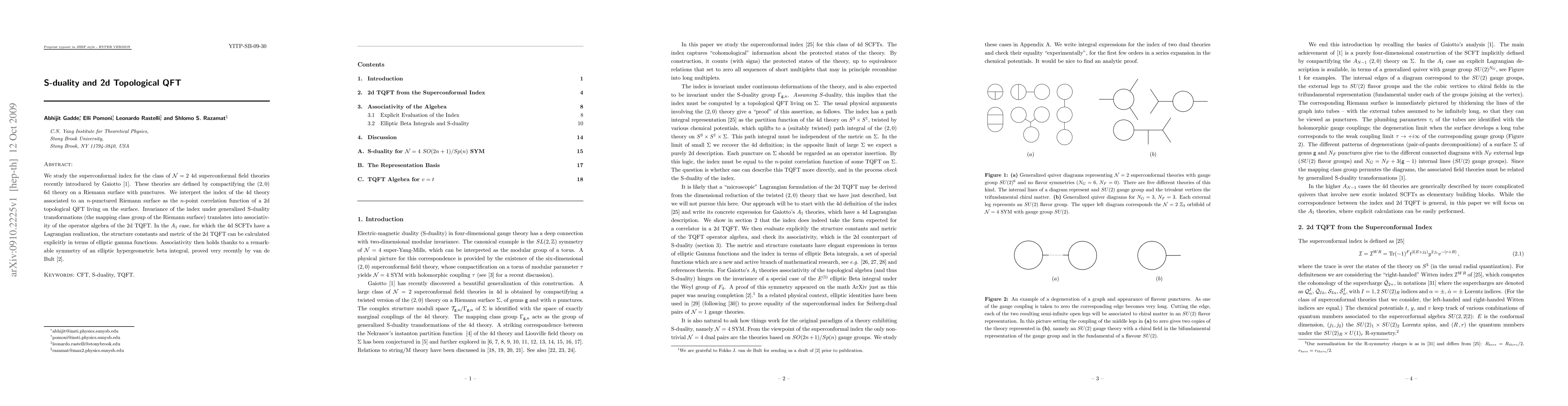 We study the superconformal index for the class of N=2 4d superconformal field theories recently introduced by Gaiotto. These theories are defined by compactifying the (2,0) 6d theory on a Riemann surface with punctures. We interpret the index of the 4d theory associated to an n-punctured Riemann surface as the n-point correlation function of a 2d topological QFT living on the surface. Invariance of the index under generalized S-duality transformations (the mapping class group of the Riemann surface) translates into associativity of the operator algebra of the 2d TQFT. In the A_1 case, for which the 4d SCFTs have a Lagrangian realization, the structure constants and metric of the 2d TQFT can be calculated explicitly in terms of elliptic gamma functions. Associativity then holds thanks to a remarkable symmetry of an elliptic hypergeometric beta integral, proved very recently by van de Bult.