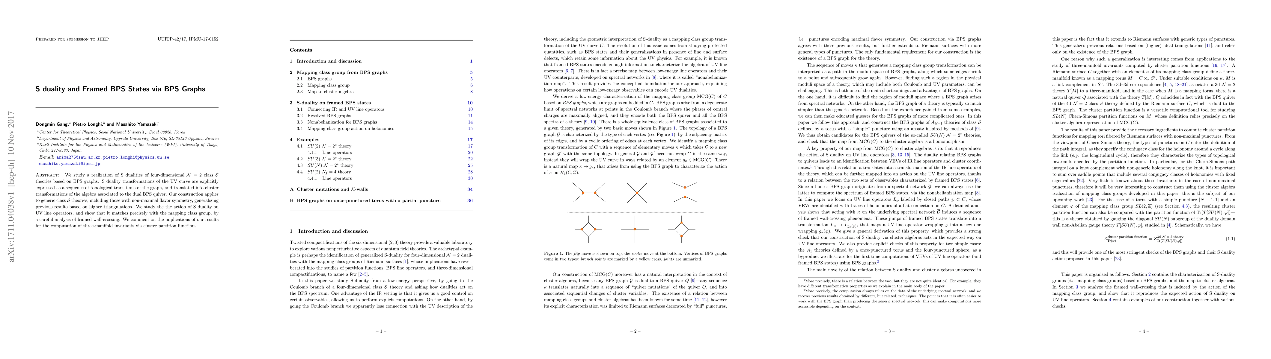 We study a realization of S dualities of four-dimensional $\mathcal{N}=2$ class $\mathcal{S}$ theories based on BPS graphs. S duality transformations of the UV curve are explicitly expressed as a sequence of topological transitions of the graph, and translated into cluster transformations of the algebra associated to the dual BPS quiver. Our construction applies to generic class $\mathcal{S}$ theories, including those with non-maximal flavor symmetry, generalizing previous results based on higher triangulations. We study the the action of S duality on UV line operators, and show that it matches precisely with the mapping class group, by a careful analysis of framed wall-crossing. We comment on the implications of our results for the computation of three-manifold invariants via cluster partition functions.