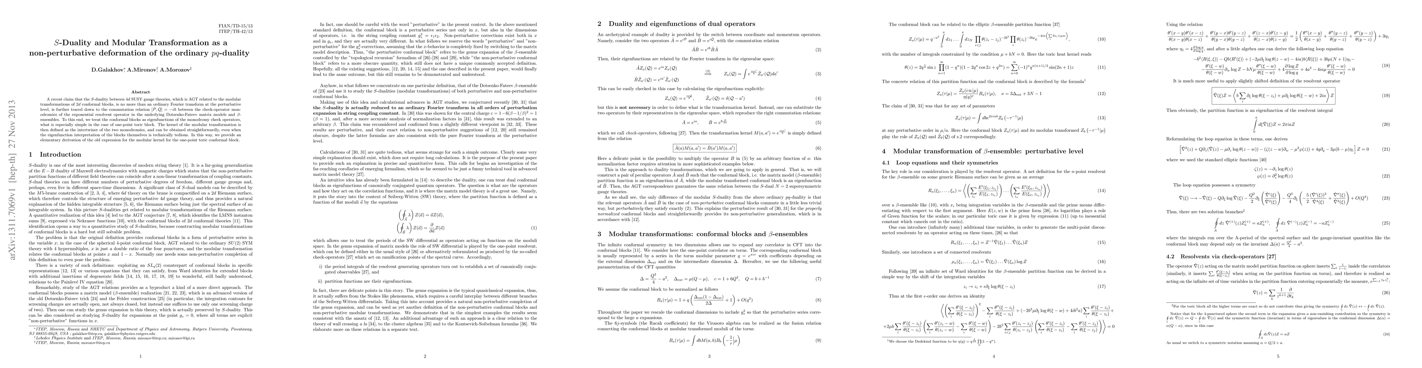 A recent claim that the S-duality between 4d SUSY gauge theories, which is AGT related to the modular transformations of 2d conformal blocks, is no more than an ordinary Fourier transform at the perturbative level, is further traced down to the commutation relation [P,Q]=-i\hbar between the check-operator monodromies of the exponential resolvent operator in the underlying Dotsenko-Fateev matrix models and beta-ensembles. To this end, we treat the conformal blocks as eigenfunctions of the monodromy check operators, what is especially simple in the case of one-point toric block. The kernel of the modular transformation is then defined as the intertwiner of the two monodromies, and can be obtained straightforwardly, even when the eigenfunction interpretation of the blocks themselves is technically tedious. In this way, we provide an elementary derivation of the old expression for the modular kernel for the one-point toric conformal block.