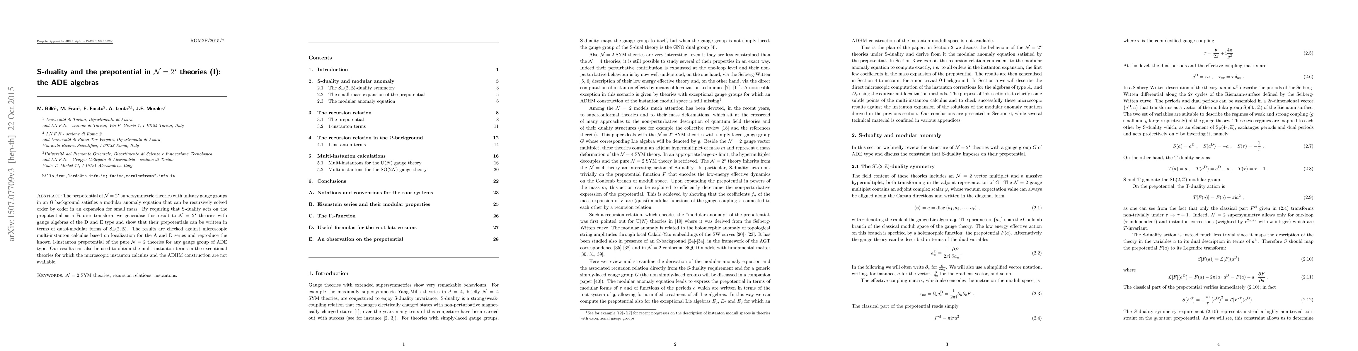 The prepotential of N=2* supersymmetric theories with unitary gauge groups in an Omega-background satisfies a modular anomaly equation that can be recursively solved order by order in an expansion for small mass. By requiring that S-duality acts on the prepotential as a Fourier transform we generalise this result to N=2* theories with gauge algebras of the D and E type and show that their prepotentials can be written in terms of quasi-modular forms of SL(2,Z). The results are checked against microscopic multi-instanton calculus based on localization for the A and D series and reproduce the known 1-instanton prepotential of the pure N=2 theories for any gauge group of ADE type. Our results can also be used to obtain the multi-instanton terms in the exceptional theories for which the microscopic instanton calculus and the ADHM construction are not available.