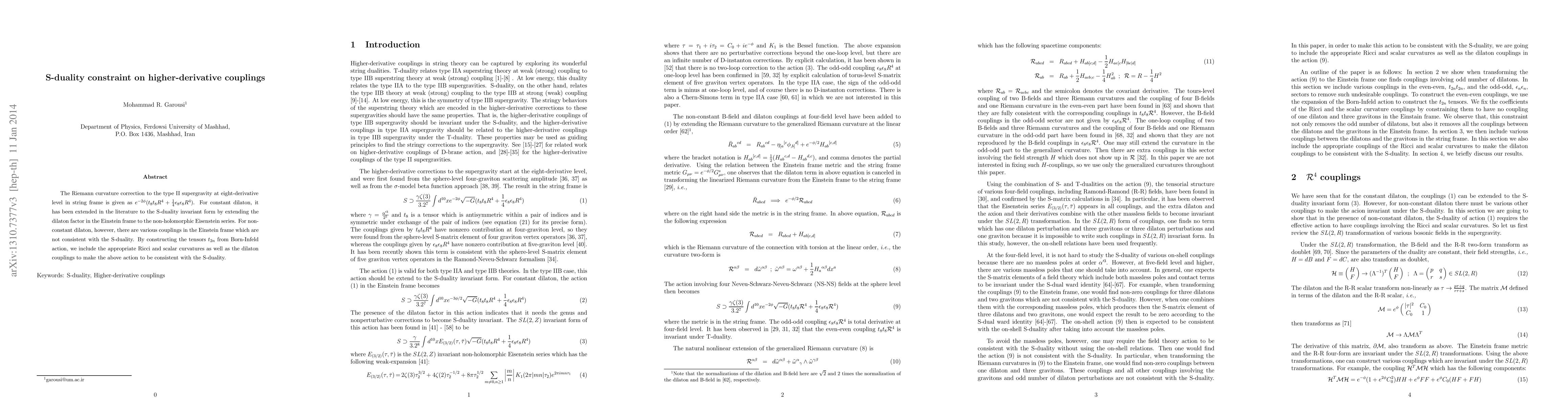 This paper investigates the S-duality constraint on higher-derivative couplings in type II supergravity, specifically addressing the eight-derivative level. It proposes a method to extend the S-duality invariant form to non-constant dilaton scenarios by incorporating tensors $t_{2n}$ derived from the Born-Infeld action, ensuring consistency with S-duality.
