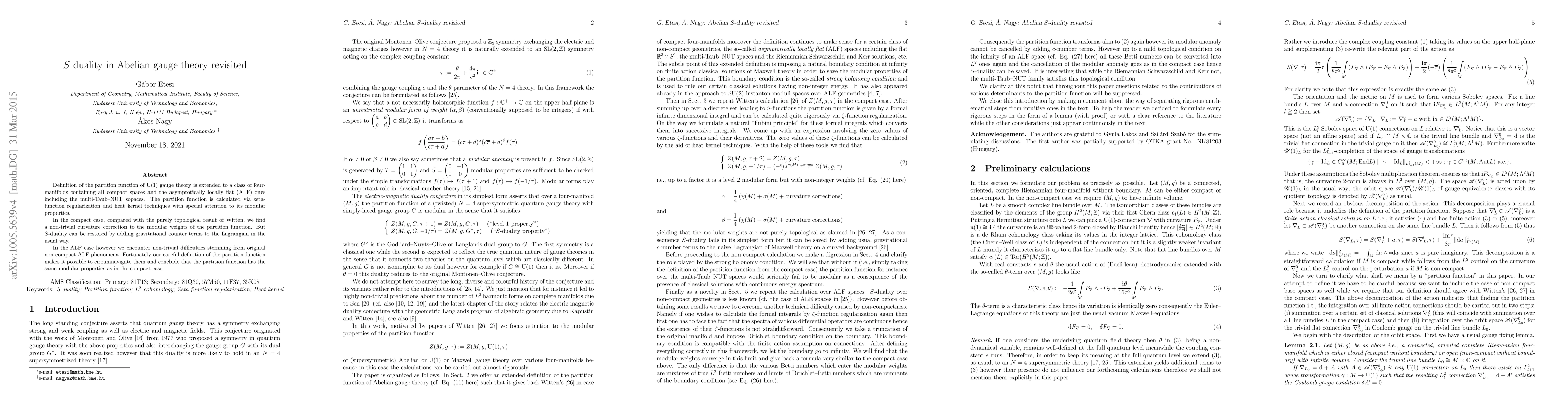 Definition of the partition function of U(1) gauge theory is extended to a class of four-manifolds containing all compact spaces and certain asymptotically locally flat (ALF) ones including the multi-Taub--NUT spaces. The partition function is calculated via zeta-function regularization with special attention to its modular properties. In the compact case, compared with the purely topological result of Witten, we find a non-trivial curvature correction to the modular weights of the partition function. But S-duality can be restored by adding gravitational counter terms to the Lagrangian in the usual way. In the ALF case however we encounter non-trivial difficulties stemming from original non-compact ALF phenomena. Fortunately our careful definition of the partition function makes it possible to circumnavigate them and conclude that the partition function has the same modular properties as in the compact case.