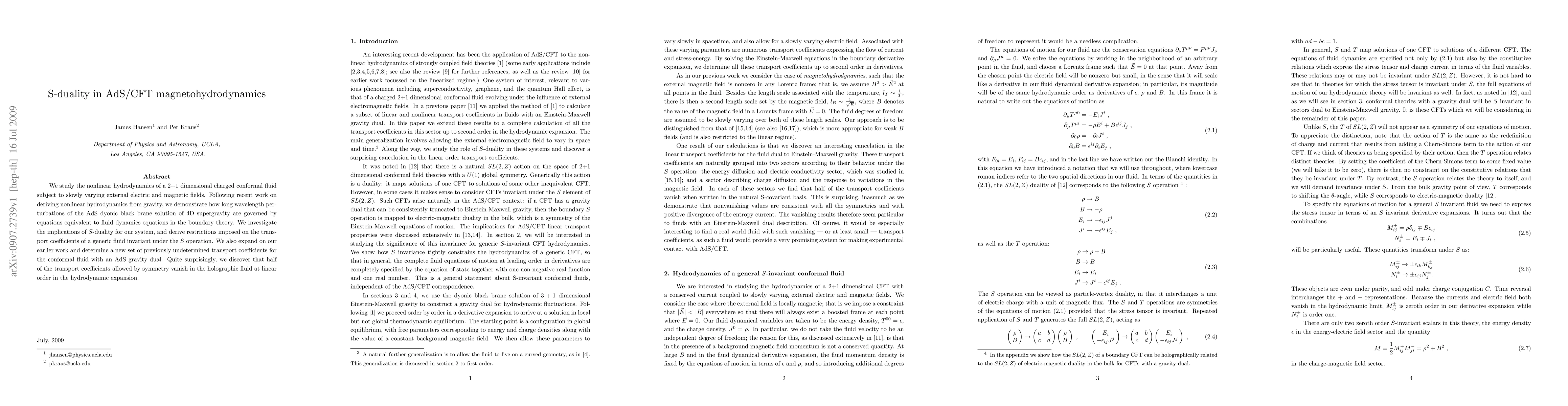 Researchers study the nonlinear hydrodynamics of a charged fluid in the presence of electric and magnetic fields, finding that half of its transport coefficients vanish under S-duality.