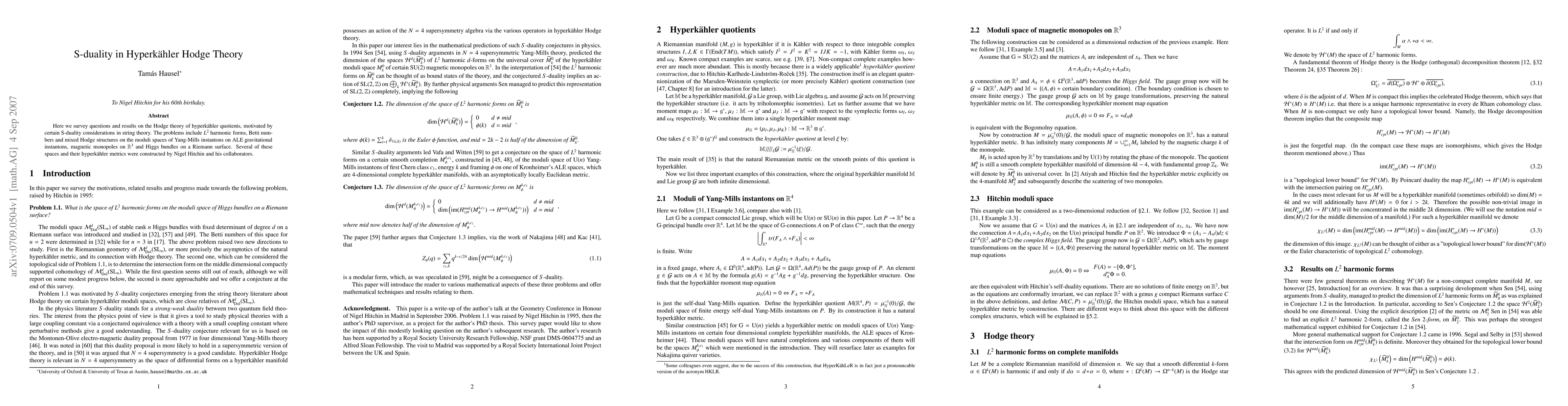 This paper surveys Hodge theory for hyperkaehler quotients, emphasizing L^2 harmonic forms and mixed Hodge structures, motivated by S-duality in string theory. It explores moduli spaces of instantons, monopoles, and Higgs bundles, with key constructions attributed to Nigel Hitchin and colleagues.