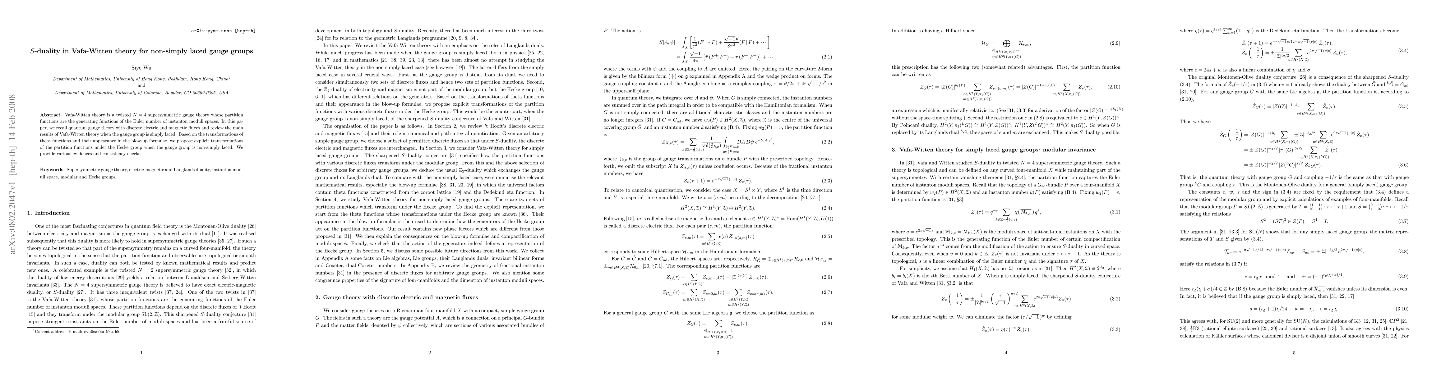 Vafa-Witten theory is a twisted N=4 supersymmetric gauge theory whose partition functions are the generating functions of the Euler number of instanton moduli spaces. In this paper, we recall quantum gauge theory with discrete electric and magnetic fluxes and review the main results of Vafa-Witten theory when the gauge group is simply laced. Based on the transformations of theta functions and their appearance in the blow-up formulae, we propose explicit transformations of the partition functions under the Hecke group when the gauge group is non-simply laced. We provide various evidences and consistency checks.