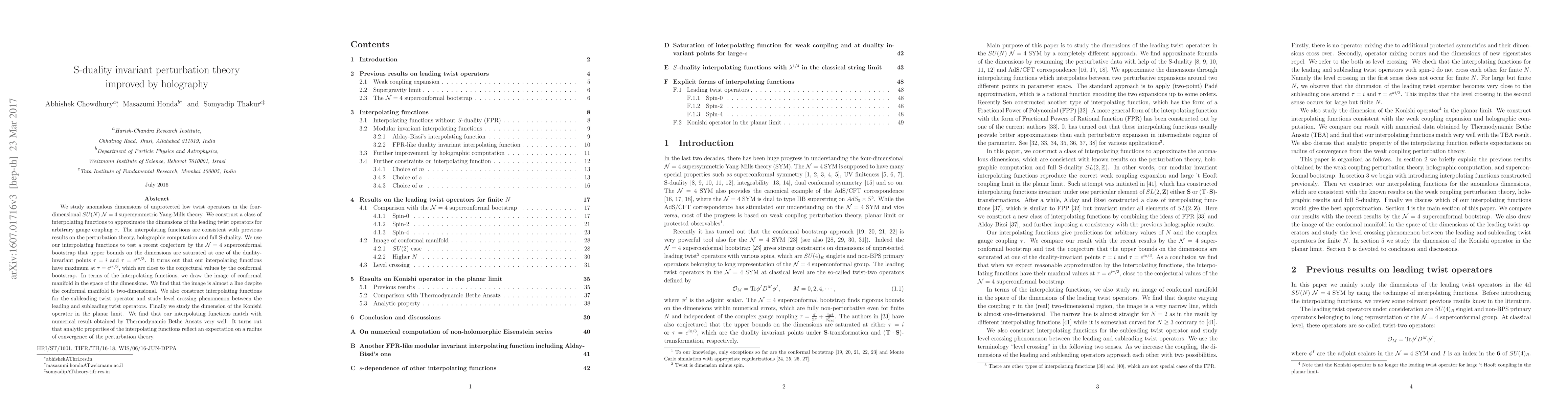 We study anomalous dimensions of unprotected low twist operators in the four-dimensional $SU(N)$ $\mathcal{N}=4$ supersymmetric Yang-Mills theory. We construct a class of interpolating functions to approximate the dimensions of the leading twist operators for arbitrary gauge coupling $\tau$. The interpolating functions are consistent with previous results on the perturbation theory, holographic computation and full S-duality. We use our interpolating functions to test a recent conjecture by the $\mathcal{N}=4$ superconformal bootstrap that upper bounds on the dimensions are saturated at one of the duality-invariant points $\tau =i$ and $\tau =e^{i\pi /3}$. It turns out that our interpolating functions have maximum at $\tau =e^{i\pi /3}$, which are close to the conjectural values by the conformal bootstrap. In terms of the interpolating functions, we draw the image of conformal manifold in the space of the dimensions. We find that the image is almost a line despite the conformal manifold is two-dimensional. We also construct interpolating functions for the subleading twist operator and study level crossing phenomenon between the leading and subleading twist operators. Finally we study the dimension of the Konishi operator in the planar limit. We find that our interpolating functions match with numerical result obtained by Thermodynamic Bethe Ansatz very well. It turns out that analytic properties of the interpolating functions reflect an expectation on a radius of convergence of the perturbation theory.