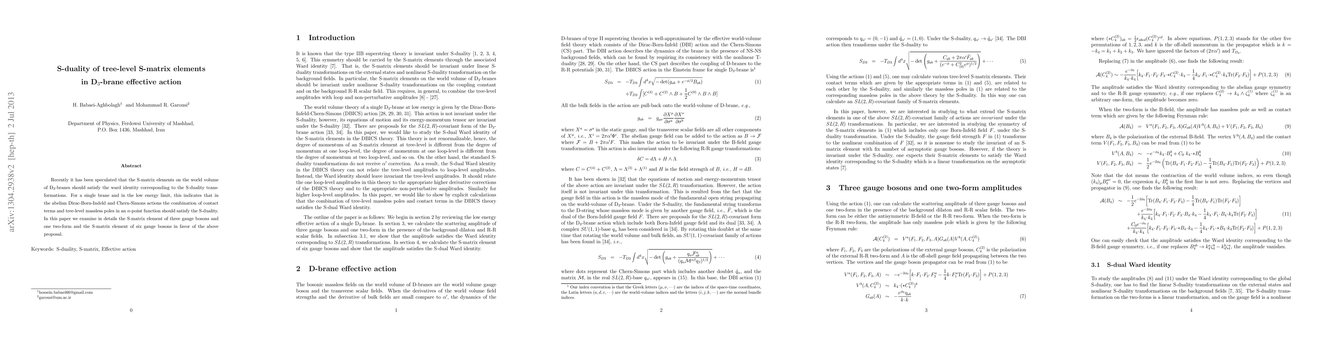 Recently it has been speculated that the S-matrix elements on the world volume of D$_3$-branes should satisfy the ward identity corresponding to the S-duality transformations. For a single brane and in the low energy limit, this indicates that in the abelian Dirac-Born-Indeld-Chern-Simons theory the combination of contact terms and tree-level massless poles in an $n$-point function should satisfy the S-duality. In this paper we examine in details the S-matrix element of three gauge bosons and one two-form and the S-matrix element of six gauge bosons in favor of the above proposal.