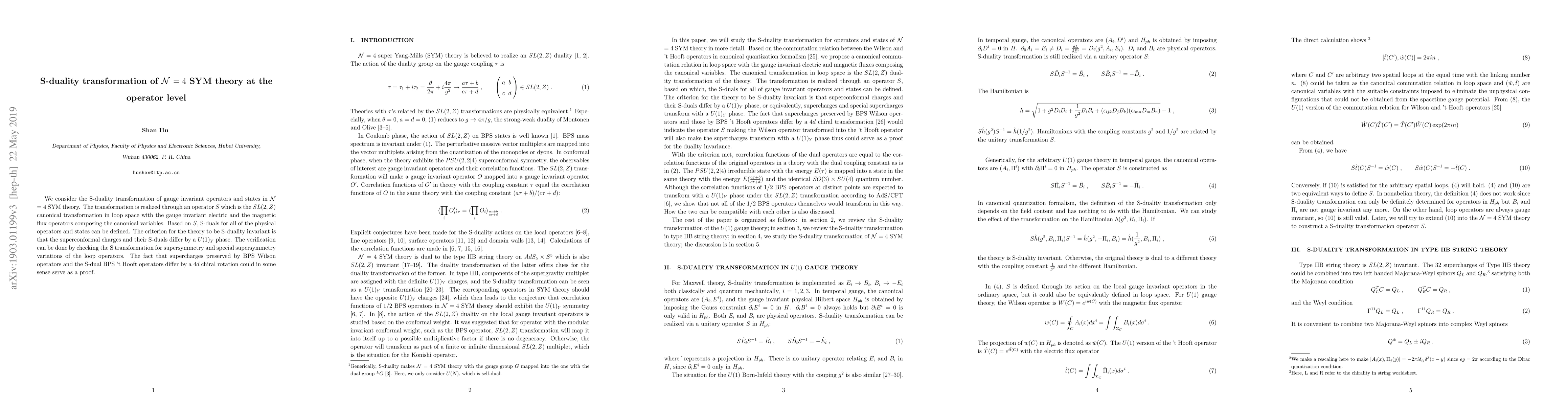 This paper explores the S-duality transformation in $\mathcal{N} = 4$ SYM theory, defining S-duals for gauge-invariant operators and states via an $SL(2,Z)$ operator $S$. It verifies S-duality invariance by checking the transformation's effect on superconformal charges and BPS operators, showing they differ by a $U(1)_{Y}$ phase.