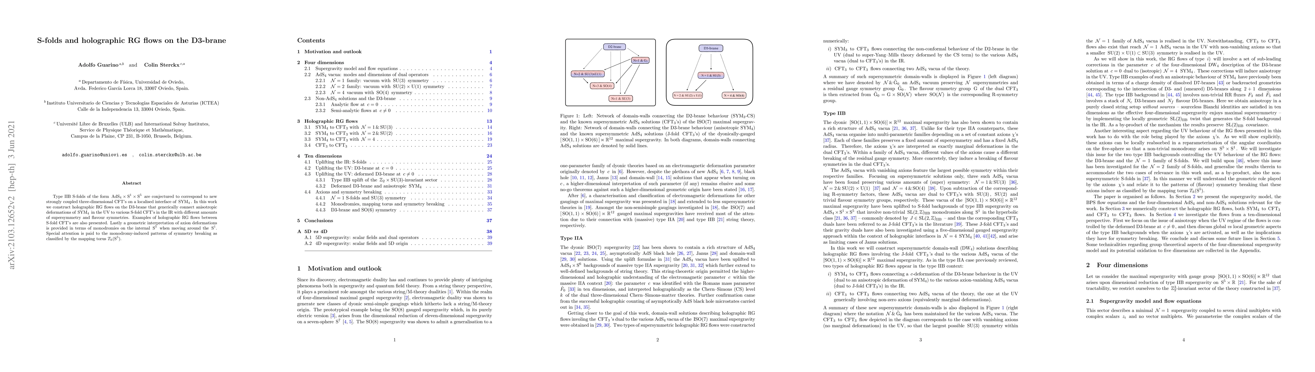 Type IIB S-folds of the form $\,\textrm{AdS}_{4} \times \textrm{S}^1 \times \textrm{S}^5\,$ are conjectured to correspond to new strongly coupled three-dimensional CFT's on a localised interface of $\,\textrm{SYM}_{4}\,$. In this work we construct holographic RG flows on the D3-brane that generically connect anisotropic deformations of $\,\textrm{SYM}_{4}\,$ in the UV to various S-fold $\textrm{CFT}$'s in the IR with different amounts of supersymmetry and flavour symmetries. Examples of holographic RG flows between \mbox{S-fold} CFT's are also presented. Lastly a geometric interpretation of axion deformations is provided in terms of monodromies on the internal $\,\textrm{S}^{5}\,$ when moving around the $\,\textrm{S}^{1}$. Special attention is paid to the monodromy-induced patterns of symmetry breaking as classified by the mapping torus $T_{h}(\textrm{S}^5)$.