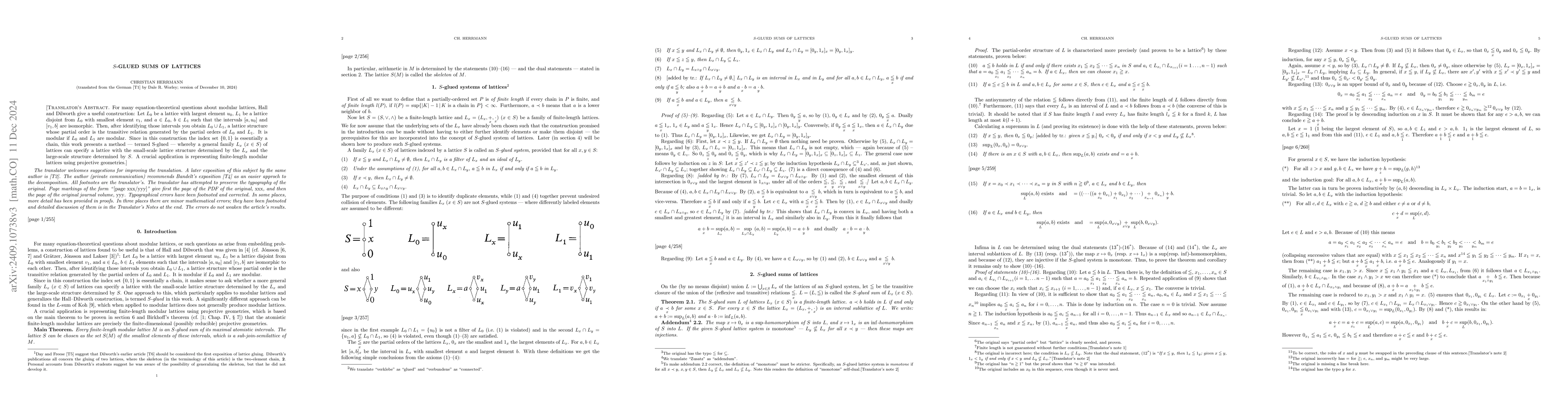 For many equation-theoretical questions about modular lattices, Hall and Dilworth give a useful construction: Let $L_0$ be a lattice with largest element $u_0$, $L_1$ be a lattice disjoint from $L_0$ with smallest element $v_1$, and $a \in L_0$, $b \in L_1$ such that the intervals $[a, u_0]$ and $[v_1, b]$ are isomorphic. Then, after identifying those intervals you obtain $L_0 \cup L_1$, a lattice structure whose partial order is the transitive relation generated by the partial orders of $L_0$ and $L_1$. It is modular if $L_0$ and $L_1$ are modular. Since in this construction the index set $\{0, 1\}$ is essentially a chain, this work presents a method -- termed S-glued -- whereby a general family $L_x\ (x \in S)$ of lattices can specify a lattice with the small-scale lattice structure determined by the $L_x$ and the large-scale structure determined by $S$. A crucial application is representing finite-length modular lattices using projective geometries.