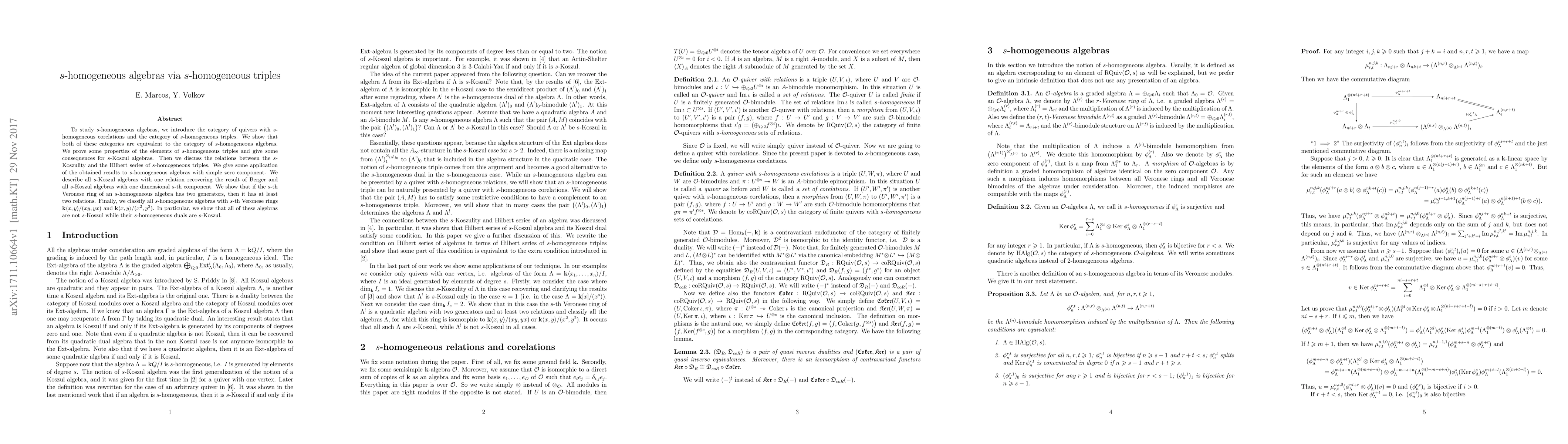 To study $s$-homogeneous algebras, we introduce the category of quivers with $s$-homogeneous corelations and the category of $s$-homogeneous triples. We show that both of these categories are equivalent to the category of $s$-homogeneous algebras. We prove some properties of the elements of $s$-homogeneous triples and give some consequences for $s$-Koszul algebras. Then we discuss the relations between the $s$-Koszulity and the Hilbert series of $s$-homogeneous triples. We give some application of the obtained results to $s$-homogeneous algebras with simple zero component. We describe all $s$-Koszul algebras with one relation recovering the result of Berger and all $s$-Koszul algebras with one dimensional $s$-th component. We show that if the $s$-th Veronese ring of an $s$-homogeneous algebra has two generators, then it has at least two relations. Finally, we classify all $s$-homogeneous algebras with $s$-th Veronese rings ${\bf k}\langle x,y\rangle/(xy,yx)$ and ${\bf k}\langle x,y\rangle/(x^2,y^2)$. In particular, we show that all of these algebras are not $s$-Koszul while their $s$-homogeneous duals are $s$-Koszul.