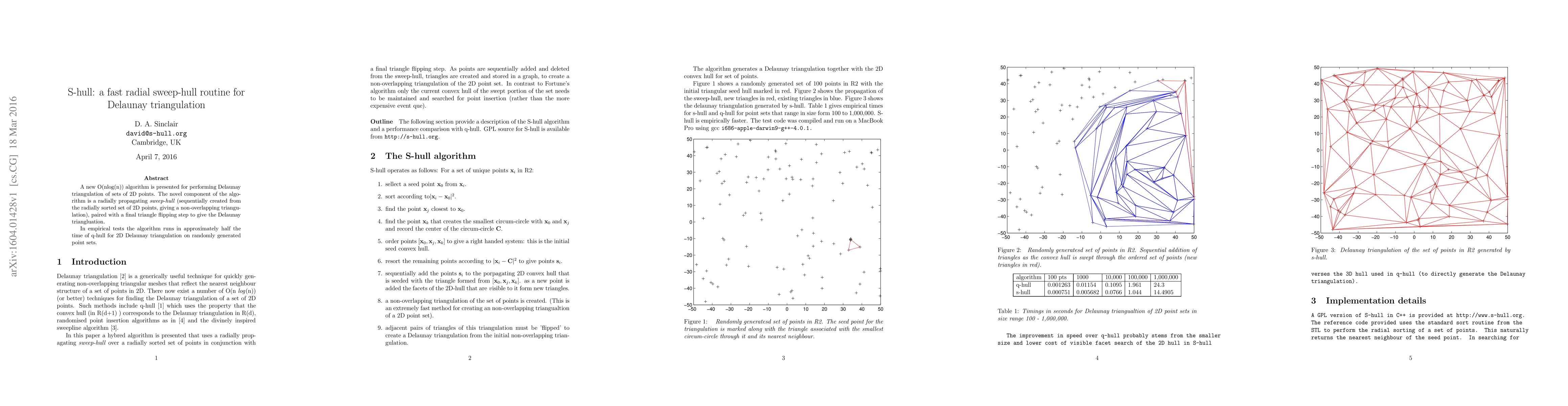 This paper introduces a new O(nlog(n)) algorithm for Delaunay triangulation using a radial sweep-hull method, which is faster than q-hull, achieving approximately half the runtime on randomly generated point sets. The algorithm constructs a non-overlapping triangulation followed by a triangle flipping step.