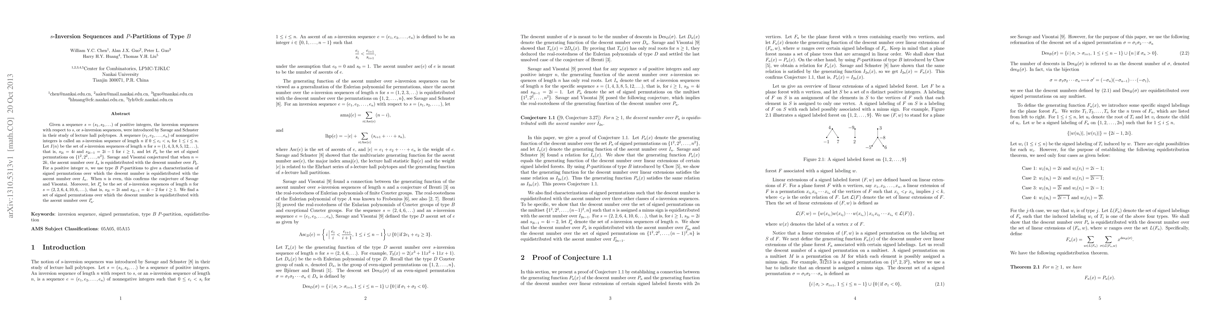 Given a sequence $s=(s_1,s_2,\ldots)$ of positive integers, the inversion sequences with respect to $s$, or $s$-inversion sequences, were introduced by Savage and Schuster in their study of lecture hall polytopes. A sequence $(e_1,e_2,\ldots,e_n)$ of nonnegative integers is called an $s$-inversion sequence of length $n$ if $0\leq e_i < s_i$ for $1\leq i\leq n$. Let I(n) be the set of $s$-inversion sequences of length $n$ for $s=(1,4,3,8,5,12,\ldots)$, that is, $s_{2i}=4i$ and $s_{2i-1}=2i-1$ for $i\geq1$, and let $P_n$ be the set of signed permutations on $\{1^2,2^2,\ldots,n^2\}$. Savage and Visontai conjectured that when $n=2k$, the ascent number over $I_n$ is equidistributed with the descent number over $P_k$. For a positive integer $n$, we use type $B$ $P$-partitions to give a characterization of signed permutations over which the descent number is equidistributed with the ascent number over $I_n$. When $n$ is even, this confirms the conjecture of Savage and Visontai. Moreover, let $I'_n$ be the set of $s$-inversion sequences of length $n$ for $s=(2,2,6,4,10,6,\ldots)$, that is, $s_{2i}=2i$ and $s_{2i-1}=4i-2$ for $i\geq1$. We find a set of signed permutations over which the descent number is equidistributed with the ascent number over $I'_n$.