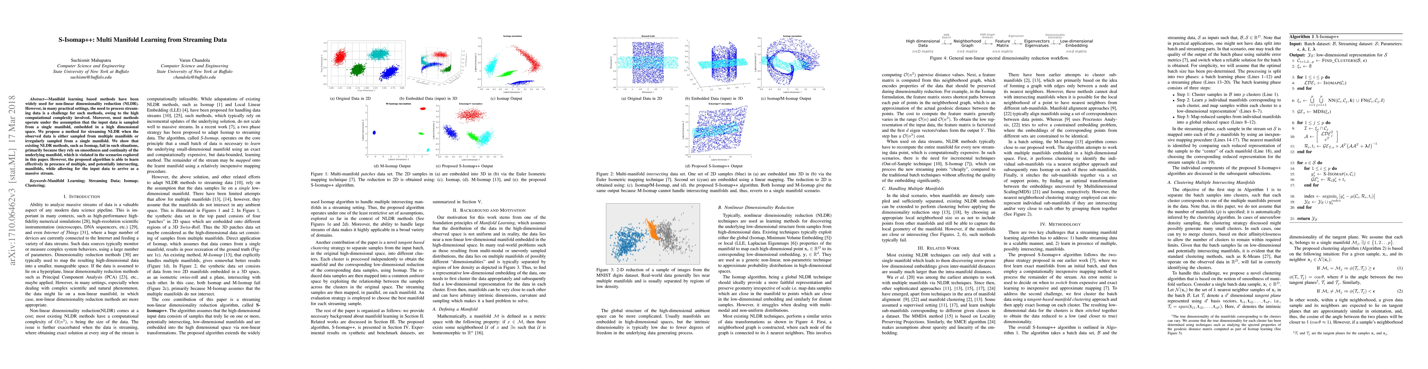 Title: S-Isomap++: Multi Manifold Learning from Streaming Data Summary: This paper proposes an advanced manifold learning method for non-linear dimensionality reduction in streaming data scenarios, addressing the limitations of existing methods that fail when data is sampled from multiple or irregularly distributed manifolds. The new algorithm effectively handles massive data streams and intersecting manifolds.