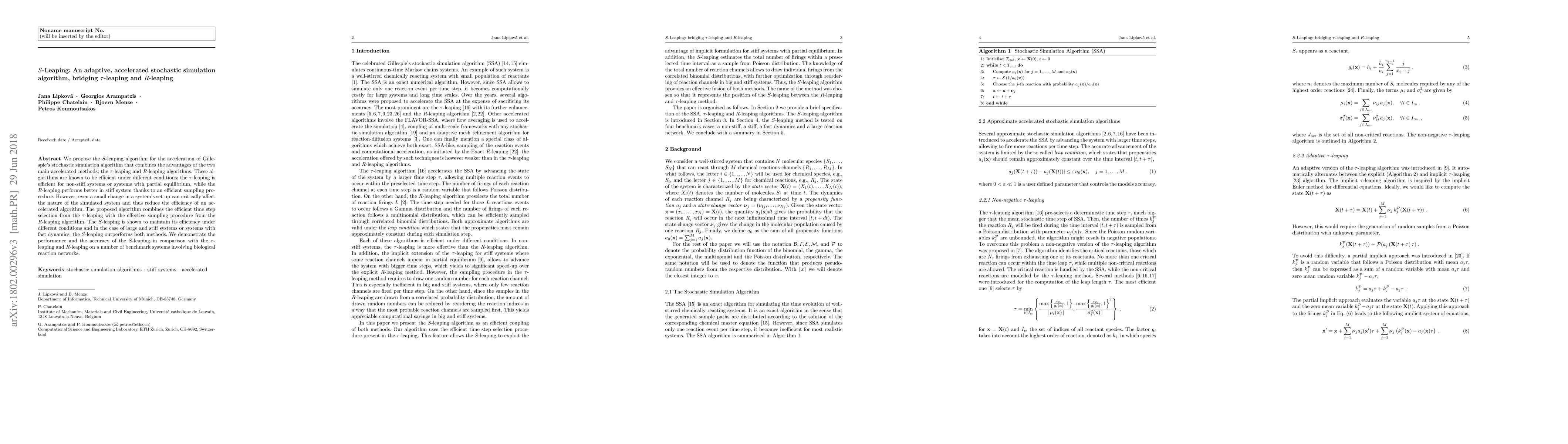 We propose the $S$-leaping algorithm for the acceleration of Gillespie's stochastic simulation algorithm that combines the advantages of the two main accelerated methods; the $\tau$-leaping and $R$-leaping algorithms. These algorithms are known to be efficient under different conditions; the $\tau$-leaping is efficient for non-stiff systems or systems with partial equilibrium, while the $R$-leaping performs better in stiff system thanks to an efficient sampling procedure. However, even a small change in a system's set up can critically affect the nature of the simulated system and thus reduce the efficiency of an accelerated algorithm. The proposed algorithm combines the efficient time step selection from the $\tau$-leaping with the effective sampling procedure from the $R$-leaping algorithm. The $S$-leaping is shown to maintain its efficiency under different conditions and in the case of large and stiff systems or systems with fast dynamics, the $S$-leaping outperforms both methods. We demonstrate the performance and the accuracy of the $S$-leaping in comparison with the $\tau$-leaping and $R$-leaping on a number of benchmark systems involving biological reaction networks.
