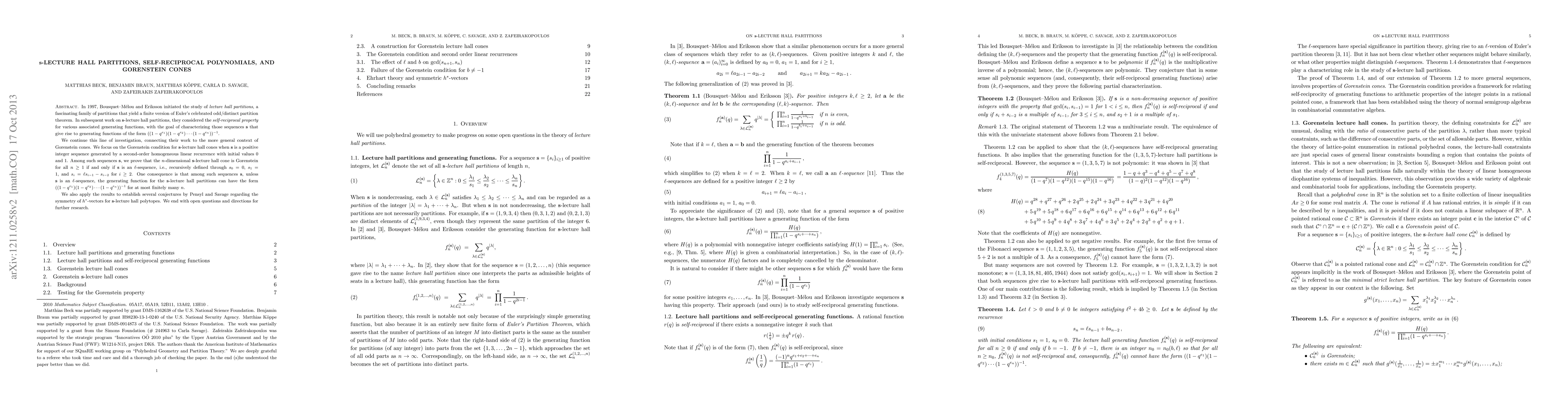 This paper investigates s-lecture hall partitions and their self-reciprocal properties, connecting them to Gorenstein cones. It proves that the n-dimensional s-lecture hall cone is Gorenstein if and only if s is an l-sequence, and resolves conjectures on the symmetry of h*-vectors for s-lecture hall polytopes.