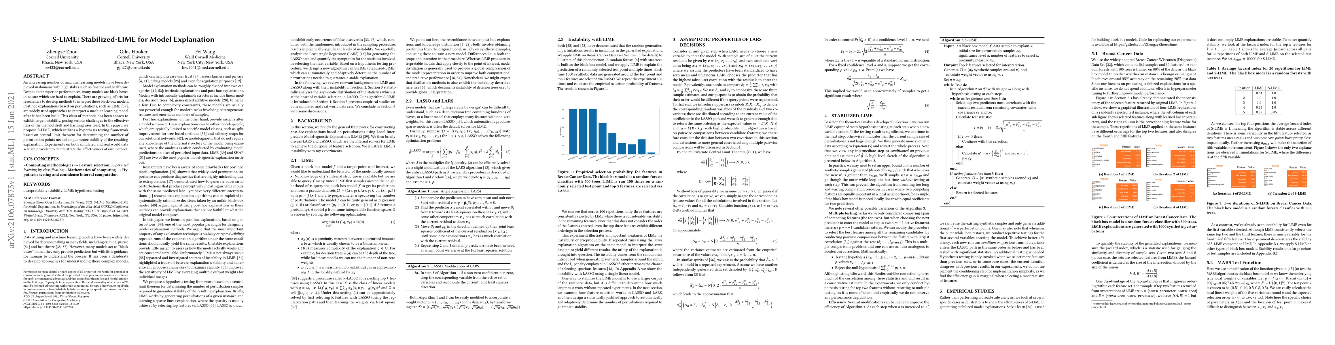 S-LIME introduces a stabilized version of LIME for interpreting black-box machine learning models, addressing the instability issue through a hypothesis testing framework based on the central limit theorem. Experiments show improved stability and effectiveness in model explanation across various datasets.