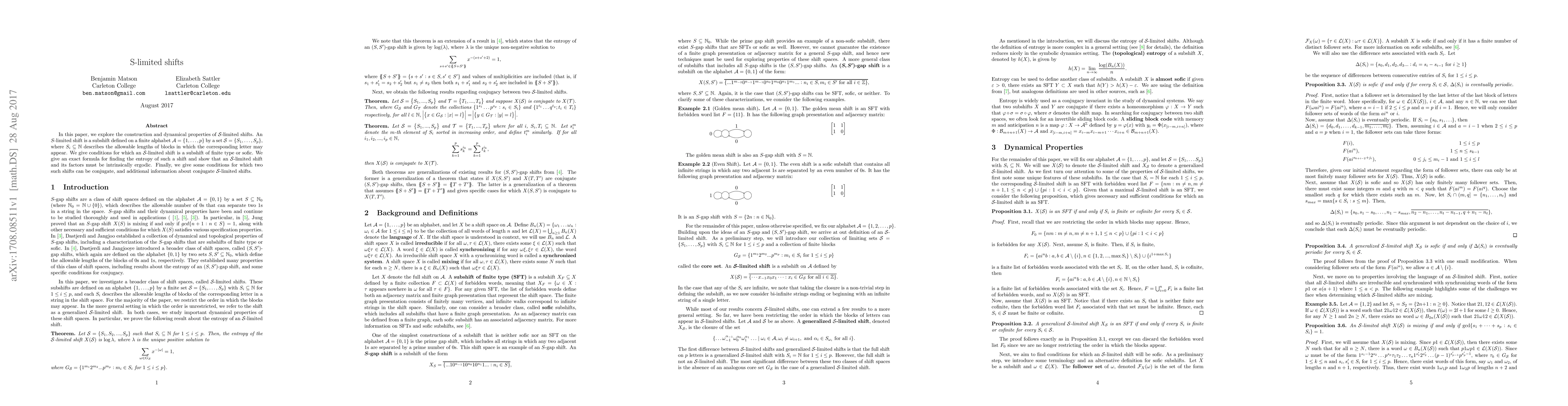 In this paper, we explore the construction and dynamical properties of $\mathcal{S}$-limited shifts. An $S$-limited shift is a subshift defined on a finite alphabet $\mathcal{A} = \{1, \ldots,p\}$ by a set $\mathcal{S} = \{S_1, \ldots, S_p\}$, where $S_i \subseteq \mathbb{N}$ describes the allowable lengths of blocks in which the corresponding letter may appear. We give conditions for which an $\mathcal{S}$-limited shift is a subshift of finite type or sofic. We give an exact formula for finding the entropy of such a shift and show that an $\mathcal{S}$-limited shift and its factors must be intrinsically ergodic. Finally, we give some conditions for which two such shifts can be conjugate, and additional information about conjugate $\mathcal{S}$-limited shifts.