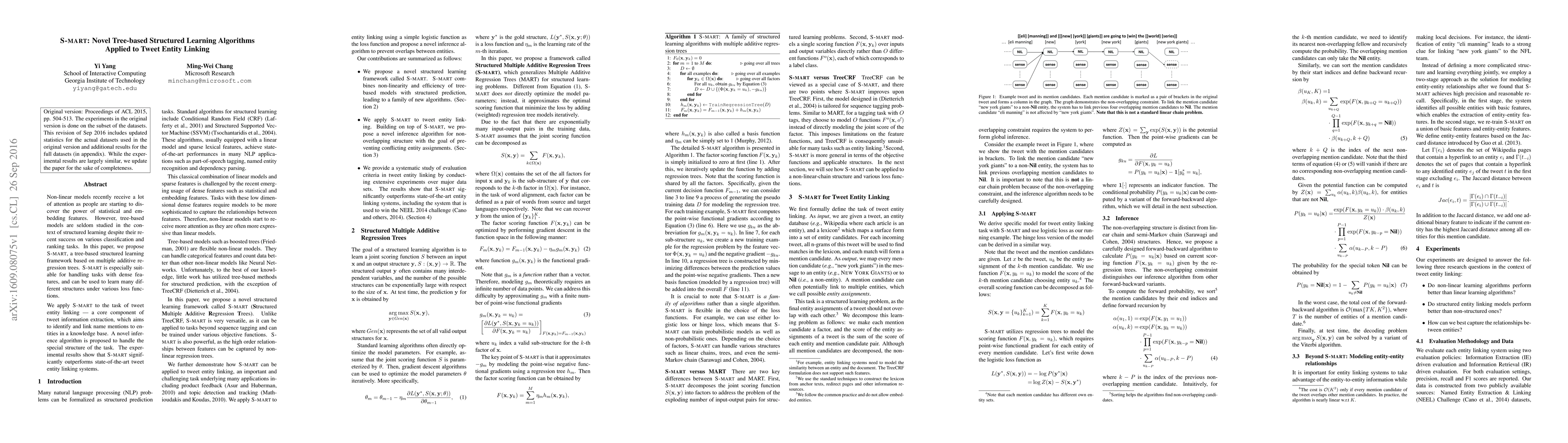 This paper introduces S-MART, a novel tree-based structured learning framework for tweet entity linking, leveraging multiple additive regression trees to handle dense features. The proposed method significantly outperforms existing systems in tweet entity linking tasks, demonstrating the effectiveness of tree-based models in structured learning.