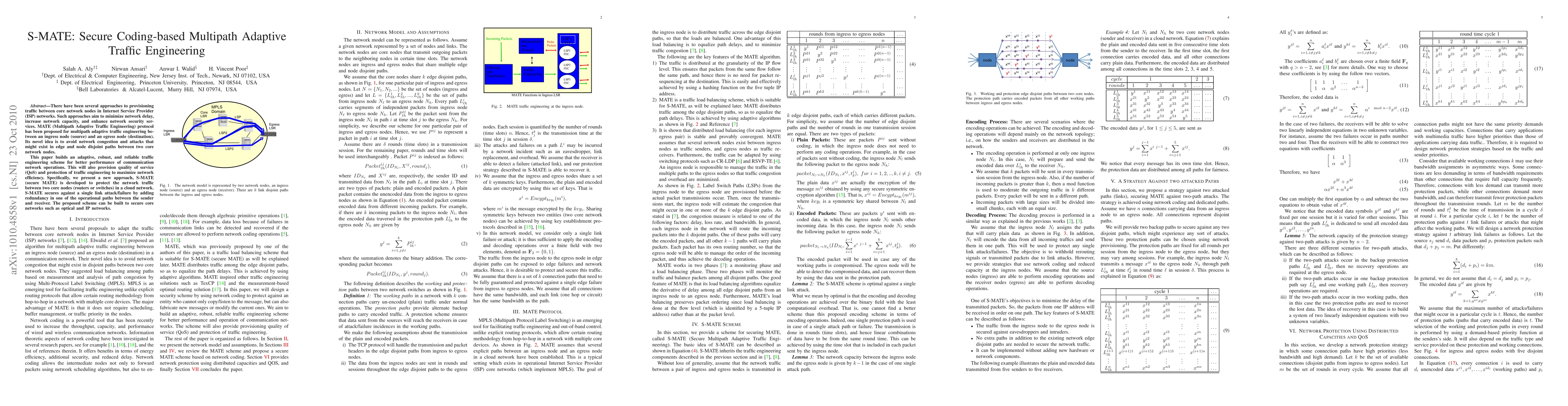 This paper introduces S-MATE, a secure coding-based multipath adaptive traffic engineering protocol designed to enhance network performance and security in ISP networks by minimizing delay, increasing capacity, and protecting against attacks. S-MATE secures network traffic between core nodes by adding redundancy to operational paths to handle single link failures.