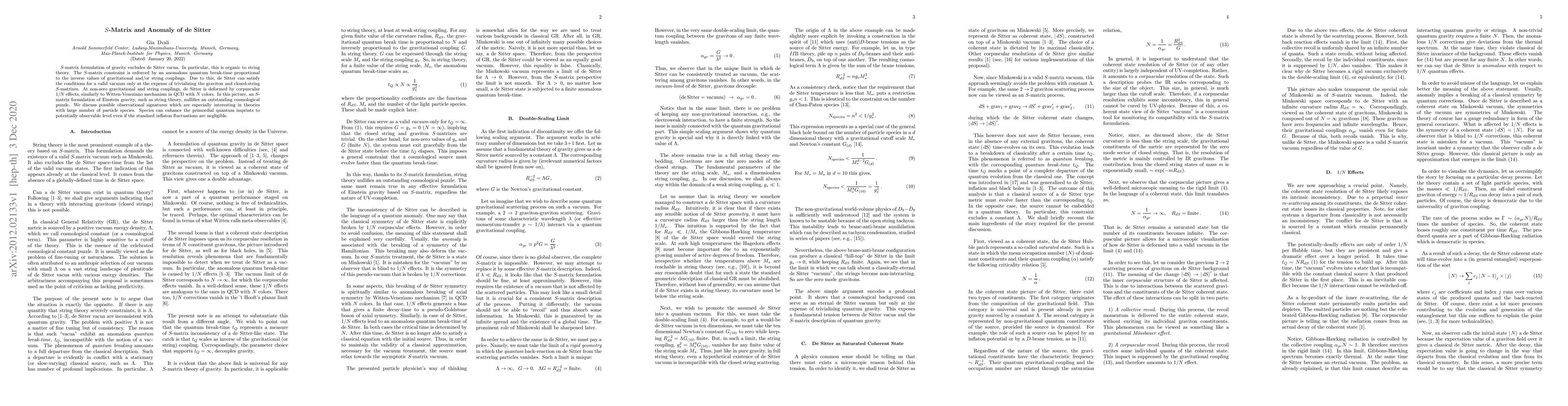 $S$-matrix formulation of gravity excludes de Sitter vacua. In particular, this is organic to string theory. The $S$-matrix constraint is enforced by an anomalous quantum break-time proportional to the inverse values of gravitational and/or string couplings. Due to this, de Sitter can satisfy the conditions for a valid vacuum only at the expense of trivializing the graviton and closed-string $S$-matrixes. At non-zero gravitational and string couplings, de Sitter is deformed by corpuscular $1/N$ effects, similarly to Witten-Veneziano mechanism in QCD with $N$ colors. In this picture, an $S$-matrix formulation of Einstein gravity, such as string theory, nullifies an outstanding cosmological puzzle. We discuss possible observational signatures which are especially interesting in theories with large number of particle species. Species can enhance the primordial quantum imprints to potentially observable level even if the standard inflaton fluctuations are negligible.