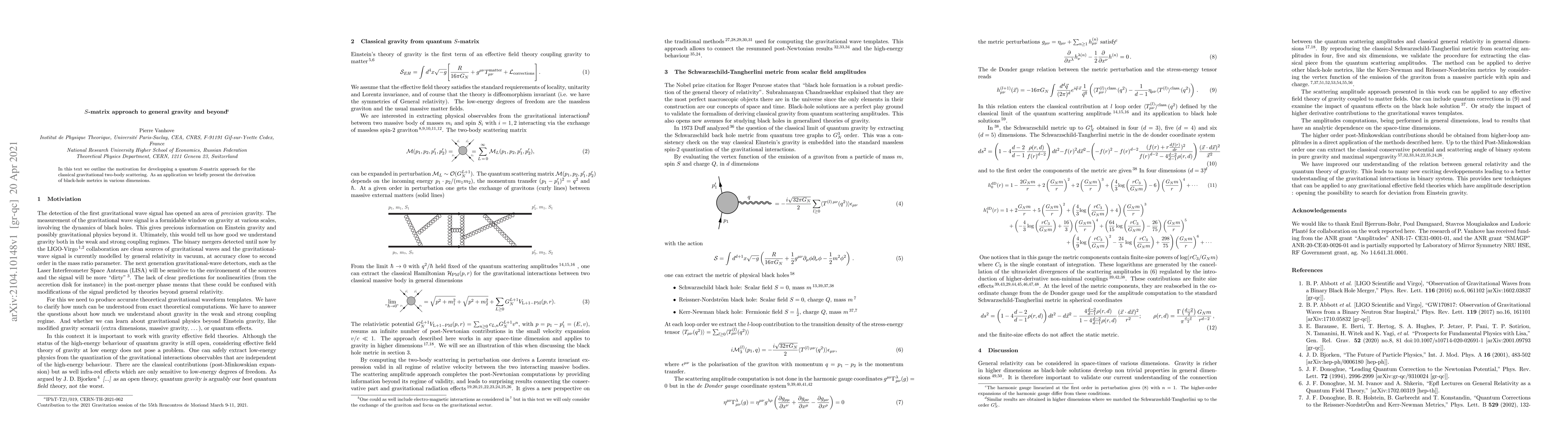 In this text we outline the motivation for developping a quantum $S$-matrix approach for the classical gravitational two-body scattering. As an application we briefly present the derivation of black-hole metrics in various dimensions.