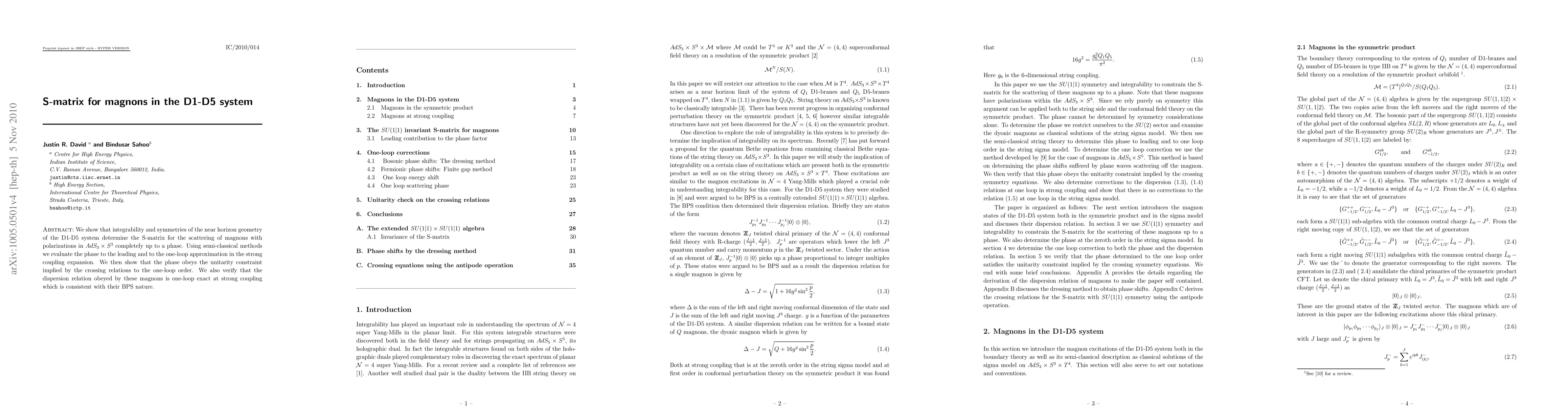 The research determines the S-matrix for magnon scattering in D1-D5 system's near-horizon geometry using integrability and symmetries, evaluating the phase to strong coupling approximations. The phase's unitarity and one-loop exact dispersion relation for magnons, consistent with their BPS nature, are verified.