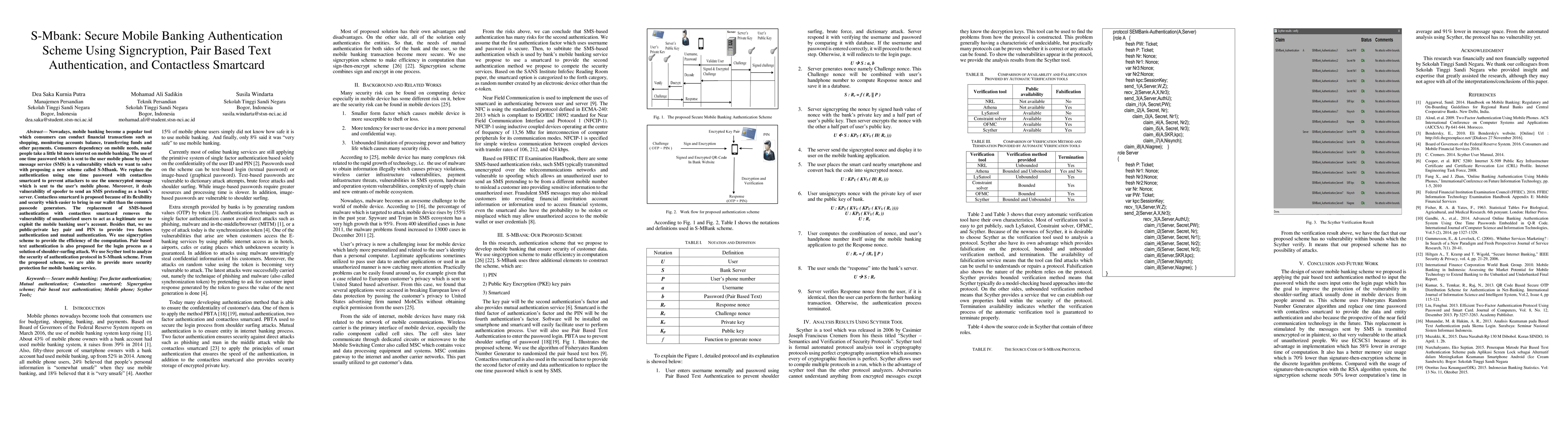 The paper proposes S-Mbank, a secure mobile banking authentication scheme that replaces SMS-based one-time passwords with a contactless smartcard for enhanced security, incorporating public-private key pair and PIN for two-factor authentication, and signcryption for efficient computation. The scheme also uses pair-based text authentication to mitigate shoulder-surfing attacks.