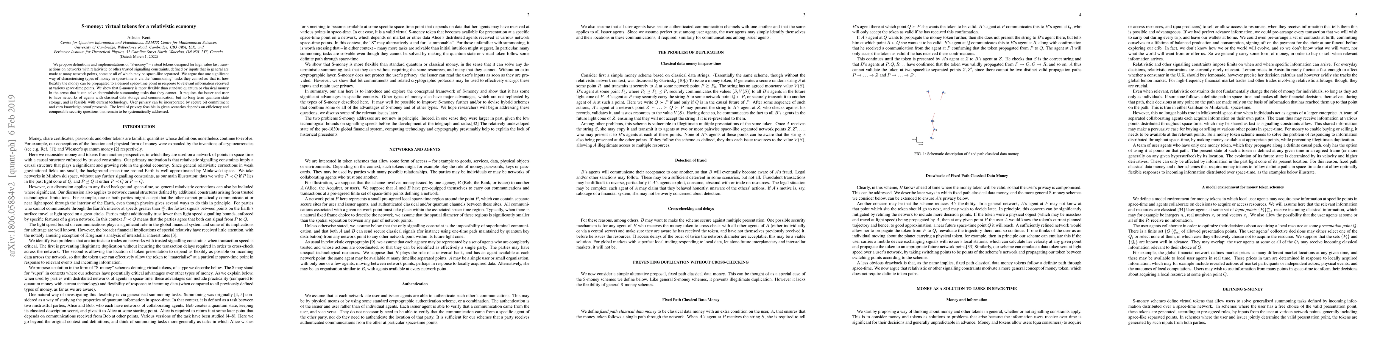 We propose definitions and implementations of "S-money" - virtual tokens designed for high value fast transactions on networks with relativistic or other trusted signalling constraints, defined by inputs that in general are made at many network points, some or all of which may be space-like separated. We argue that one significant way of characterising types of money in space-time is via the "summoning" tasks they can solve: that is, how flexibly the money can be propagated to a desired space-time point in response to relevant information received at various space-time points. We show that S-money is more flexible than standard quantum or classical money in the sense that it can solve deterministic summoning tasks that they cannot. It requires the issuer and user to have networks of agents with classical data storage and communication, but no long term quantum state storage, and is feasible with current technology. User privacy can be incorporated by secure bit commitment and zero knowledge proof protocols. The level of privacy feasible in given scenarios depends on efficiency and composable security questions that remain to be systematically addressed.