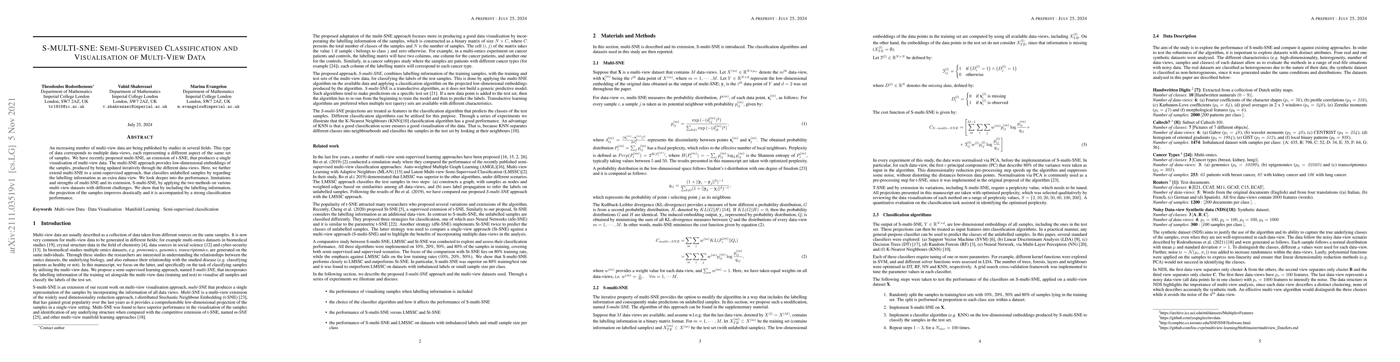 This paper proposes S-multi-SNE, a semi-supervised extension of multi-SNE, to classify and visualize multi-view data by incorporating labelling information as an additional data-view. The method significantly improves sample projection and classification performance on various multi-view datasets.