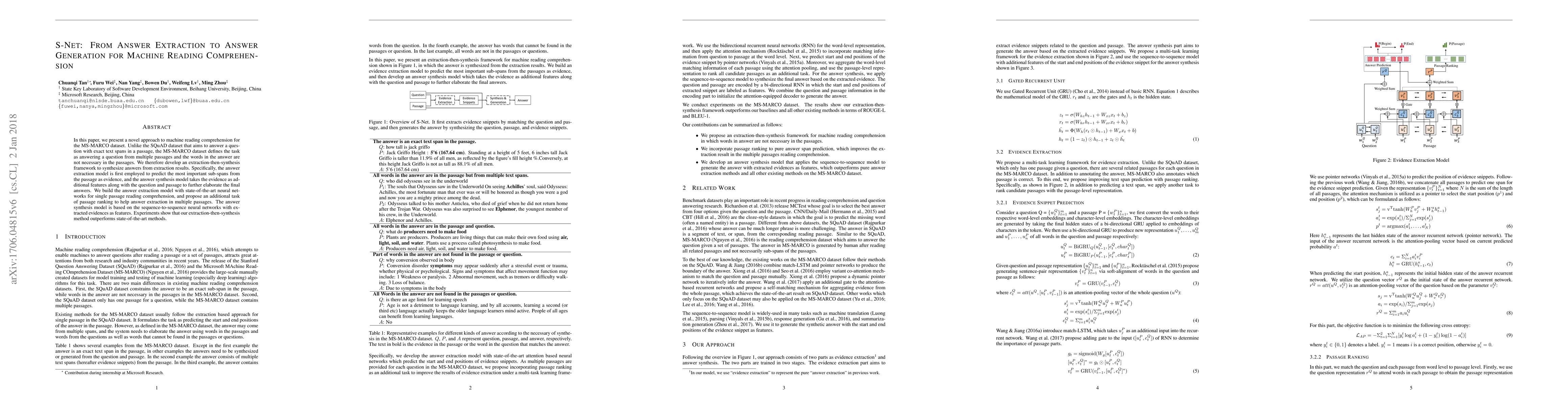 The paper presents S-Net, an extraction-then-synthesis framework for machine reading comprehension. It employs an extraction model to predict important sub-spans from passages as evidence and a synthesis model to elaborate final answers using extracted evidences, question, and passage.
