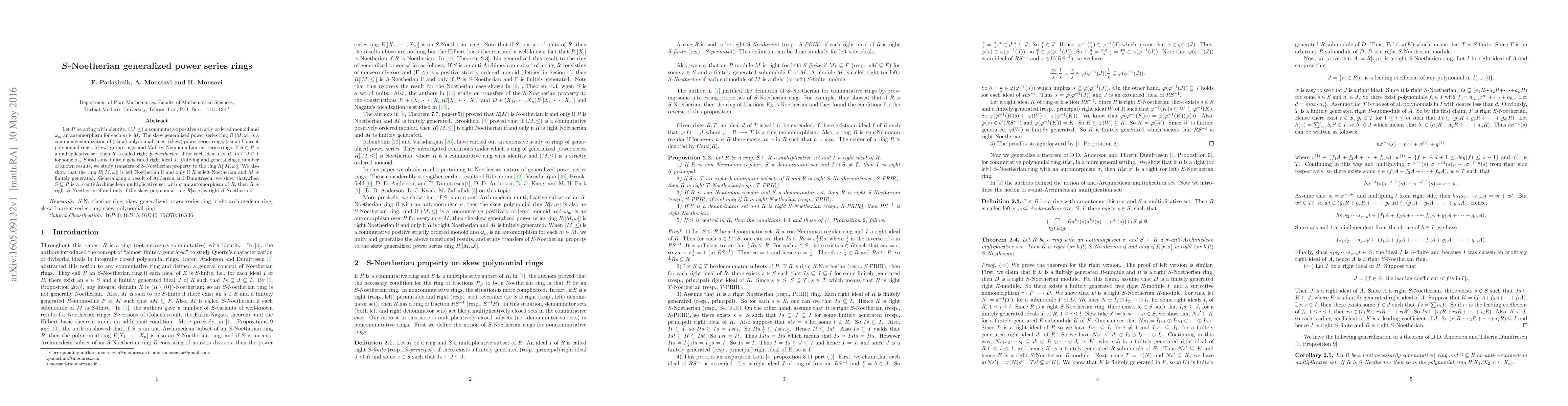 This paper explores the S-Noetherian property in the context of skew generalized power series rings R[[M,w]], generalizing various known structures. It establishes that R[[M,w]] inherits the left Noetherian property from R if M is finitely generated, and provides a condition for right S-Noetherian transfer from R to R[x,a] using a-anti-Archimedean multiplicative sets.