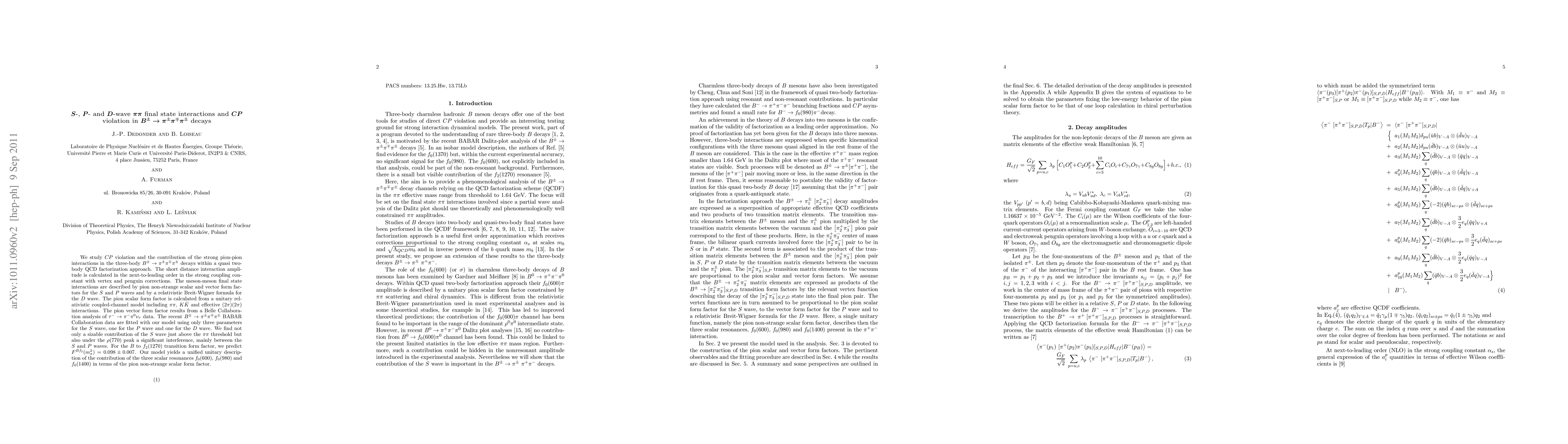 This paper investigates CP violation and strong pion-pion interactions in B+- decays to three pions, employing a quasi two-body QCD factorization approach. The study reveals significant contributions from S and P waves, especially near the pi pi threshold and under the rho(770) peak, and predicts the B to f_2(1270) transition form factor.