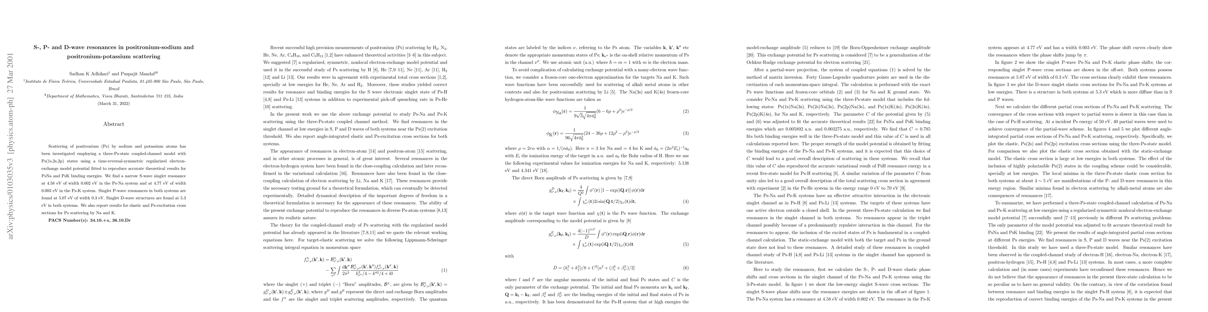 This study investigates the scattering of positronium (Ps) by sodium and potassium atoms, revealing narrow S-wave singlet resonances at 4.58 eV and 4.77 eV respectively, along with P-wave resonances at 5.07 eV and D-wave structures at 5.3 eV in both systems. Results also include elastic and Ps-excitation cross sections.