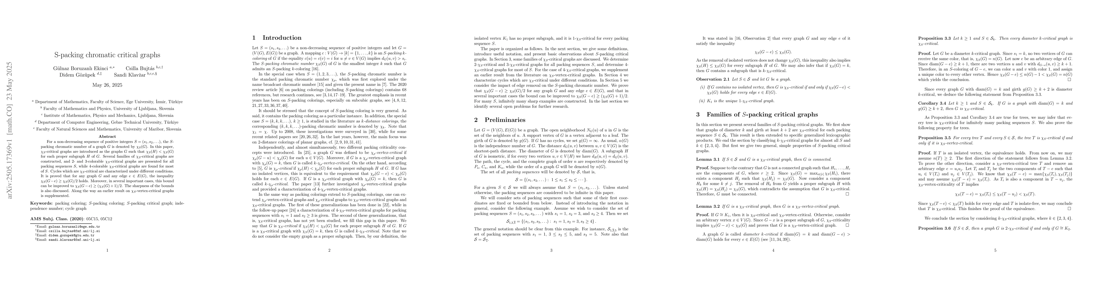 The paper presents novel constructions of $\chi_S$-critical graphs, proves inequalities related to edge removal and packing chromatic numbers, and characterizes cycles as $\chi_S$-critical under various conditions.
