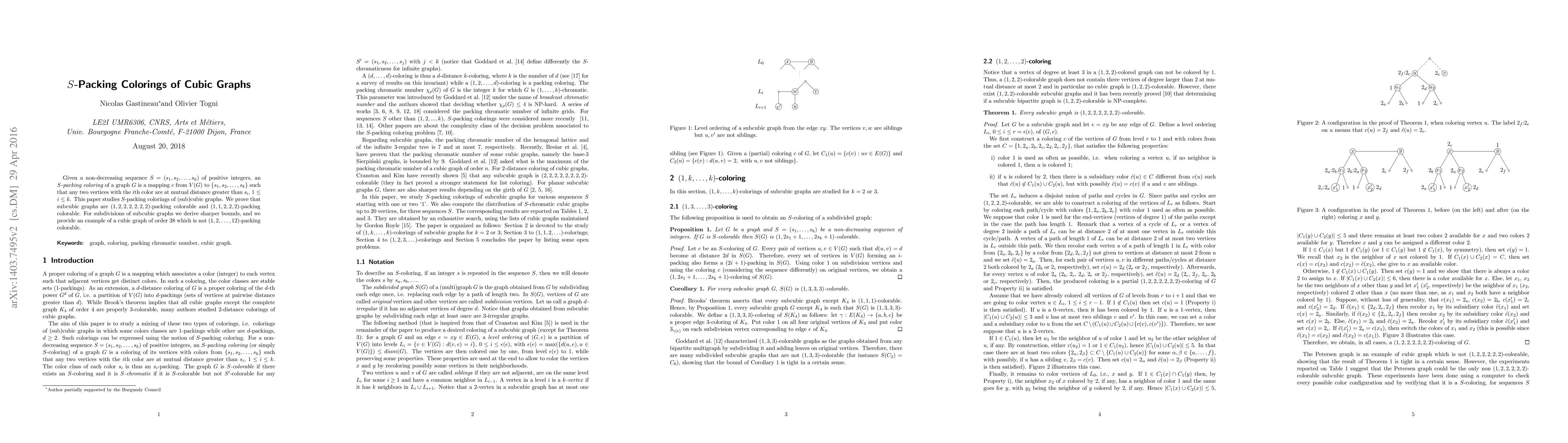 This paper investigates $S$-packing colorings of cubic graphs, defining them as mappings ensuring colored vertices maintain a minimum distance. It demonstrates that subcubic graphs can be $(1,2,2,2,2,2,2)$ and $(1,1,2,2,3)$-packing colorable, and presents an example showing a cubic graph of order 38 is not $(1,2,\ldots,12)$-packing colorable.
