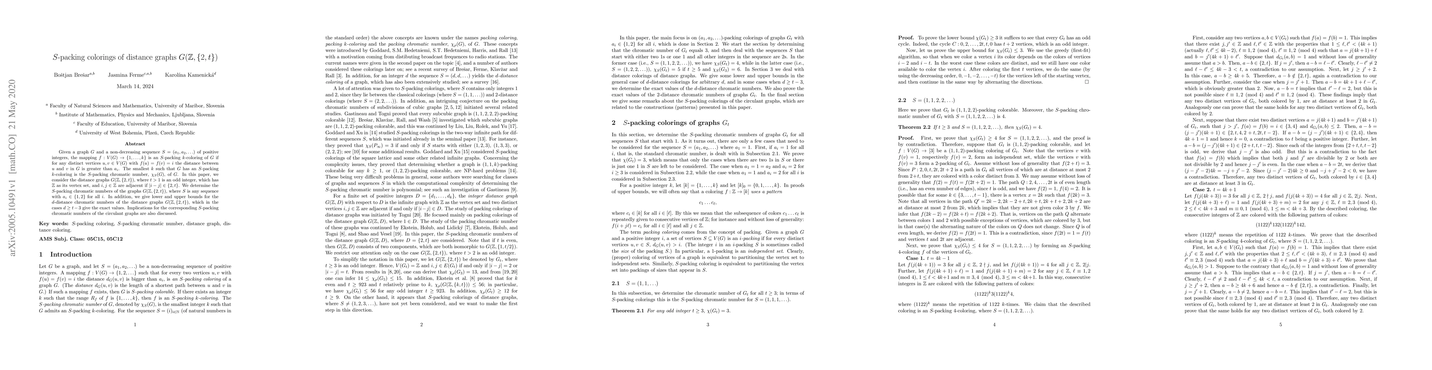 Given a graph $G$ and a non-decreasing sequence $S=(a_1,a_2,\ldots)$ of positive integers, the mapping $f:V(G) \rightarrow \{1,\ldots,k\}$ is an $S$-packing $k$-coloring of $G$ if for any distinct vertices $u,v\in V(G)$ with $f(u)=f(v)=i$ the distance between $u$ and $v$ in $G$ is greater than $a_i$. The smallest $k$ such that $G$ has an $S$-packing $k$-coloring is the $S$-packing chromatic number, $\chi_S(G)$, of $G$. In this paper, we consider the distance graphs $G(\mathbb{Z},\{2,t\})$, where $t>1$ is an odd integer, which has $\mathbb{Z}$ as its vertex set, and $i,j\in\mathbb{Z}$ are adjacent if $|i-j|\in\{2,t\}$. We determine the $S$-packing chromatic numbers of the graphs $G(\mathbb{Z},\{2,t\})$, where $S$ is any sequence with $a_i\in\{1,2\}$ for all $i$. In addition, we give lower and upper bounds for the $d$-distance chromatic numbers of the distance graphs $G(\mathbb{Z},\{2,t\})$, which in the cases $d\ge t-3$ give the exact values. Implications for the corresponding $S$-packing chromatic numbers of the circulant graphs are also discussed.