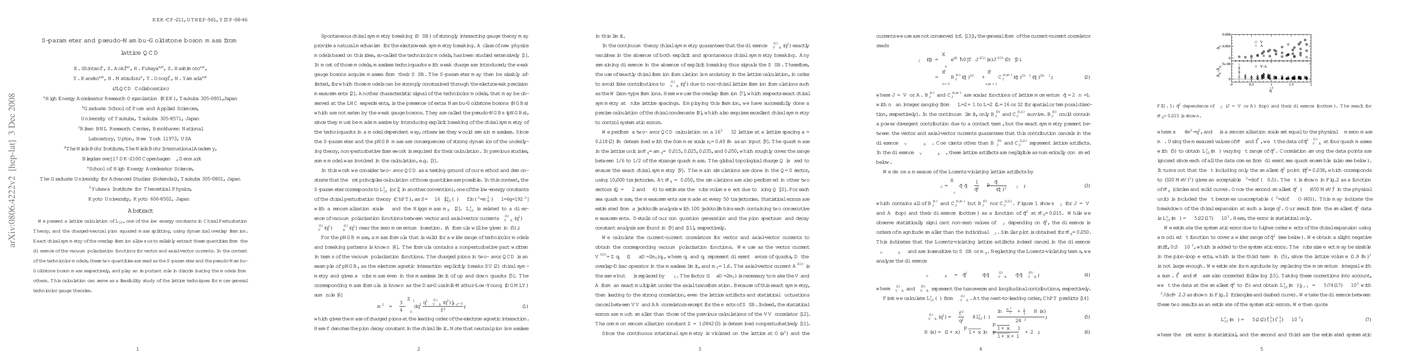 This paper reports a lattice QCD calculation of $L_{10}$ and the charged-neutral pion mass difference using dynamical overlap fermions, which are exact chiral symmetry preserving. These results correspond to the $S$-parameter and pseudo-Nambu-Goldstone boson mass, crucial for evaluating technicolor models.