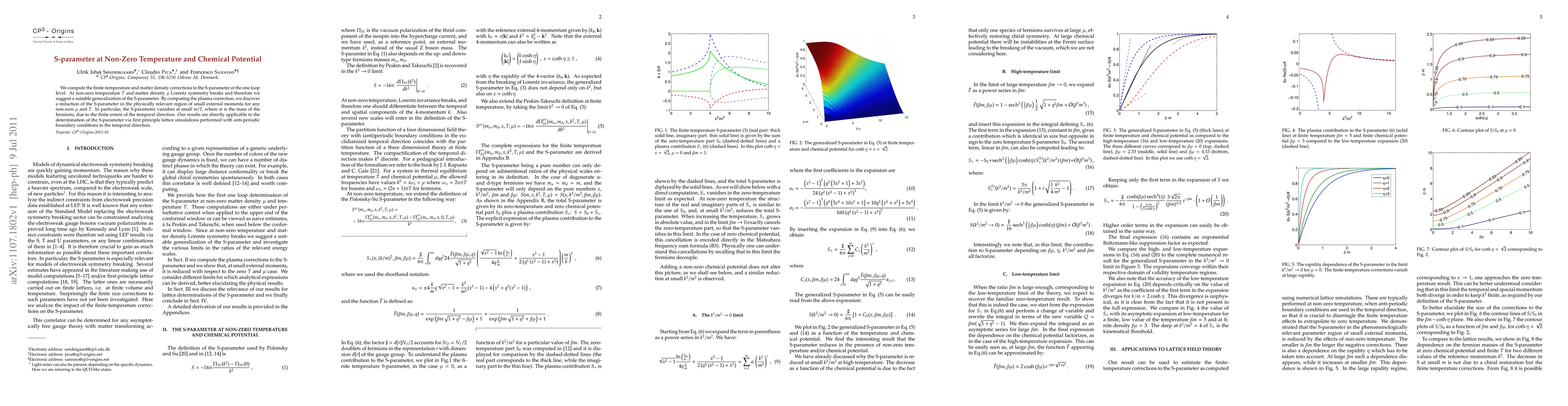 We compute the finite-temperature and matter density corrections to the S-parameter at the one loop level. At non-zero temperature T and matter density Lorentz symmetry breaks and therefore we suggest a suitable generalization of the S-parameter. By computing the plasma correction, we discover a reduction of the S-parameter in the physically relevant region of small external momenta for any non-zero chemical potential and T. In particular, the S-parameter vanishes at small m/T, where m is the mass of the fermions, due to the finite extent of the temporal direction. Our results are directly applicable to the determination of the S-parameter via first principle lattice simulations performed with anti-periodic boundary conditions in the temporal direction.