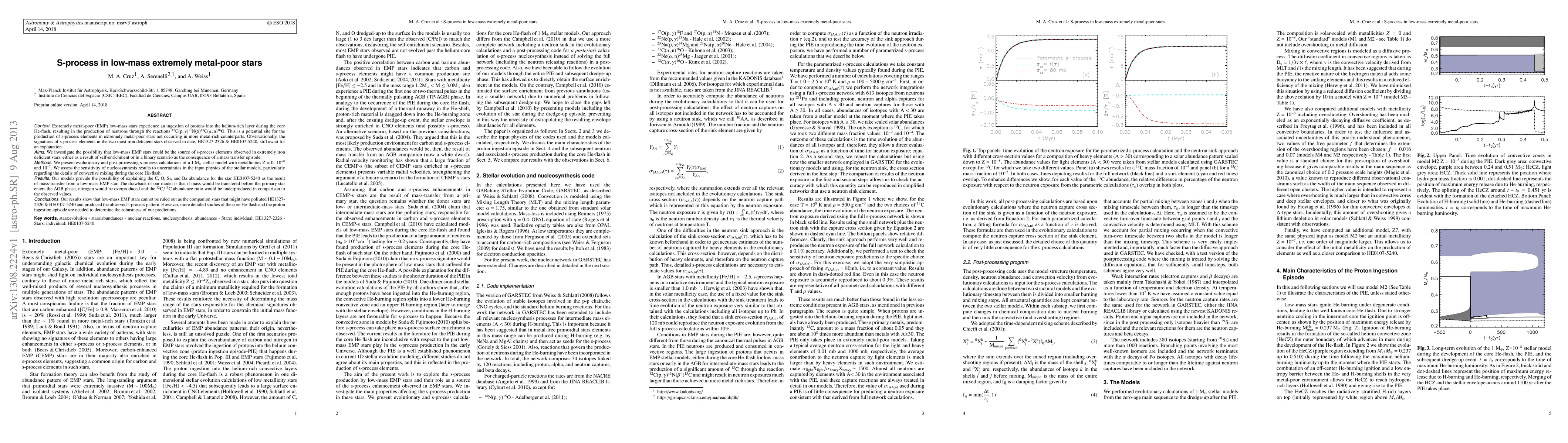 Extremely metal-poor low-mass stars experience an ingestion of protons into the helium-rich layer during the core He-flash, resulting in the production of neutrons through the reactions ^{12}C(p,\gamma)^{13}N(\beta)^{13}C(\alpha,n)^{16}O. This is a potential site for the production of s-process elements in extremely metal-poor stars not occurring in more metal-rich counterparts. Observationally, the signatures of s-process elements in the two most iron deficient stars observed to date, HE1327-2326 & HE0107-5240, still await for an explanation. We investigate the possibility that low-mass EMP stars could be the source of s-process elements observed in extremely iron deficient stars, either as a result of self-enrichment or in a binary scenario as the consequence of a mass transfer episode. We present evolutionary and post-processing s-process calculations of a 1Msun stellar model with metallicities Z=0, 10^{-8} and 10^{-7}. We assess the sensitivity of nucleosynthesis results to uncertainties in the input physics of the stellar models, particularly regarding the details of convective mixing during the core He-flash. Our models provide the possibility of explaining the C, O, Sr, and Ba abundance for the star HE0107-5240 as the result of mass-transfer from a low-mass EMP star. The drawback of our model is that if mass would be transferred before the primary star enters the AGB phase, nitrogen would be overproduced and the ^{12}C/^{13}C abundance ratio would be underproduced in comparison to the observed values. Our results show that low-mass EMP stars cannot be ruled out as the companion stars that might have polluted HE1327-2326 & HE0107-5240 and produced the observed s-process pattern. However, more detailed studies of the core He-flash and the proton ingestion episode are needed to determine the robustness of our predictions.